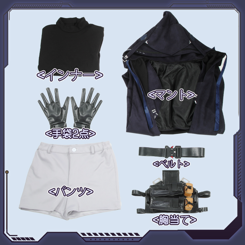 マント、インナー、パンツ、飾り物(胸当て、手袋2点、ベルト)