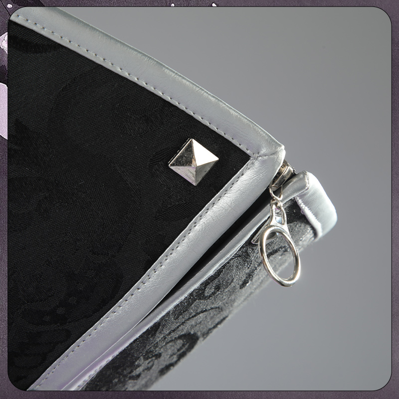 ラメニットで製作しています。黒を基調として、銀色のボタンと銀色の縁取りが付いて綺麗に見えます。正面にチャックが付いて脱着が便利です。