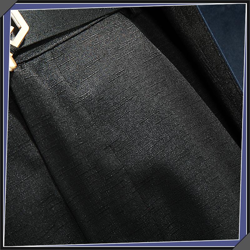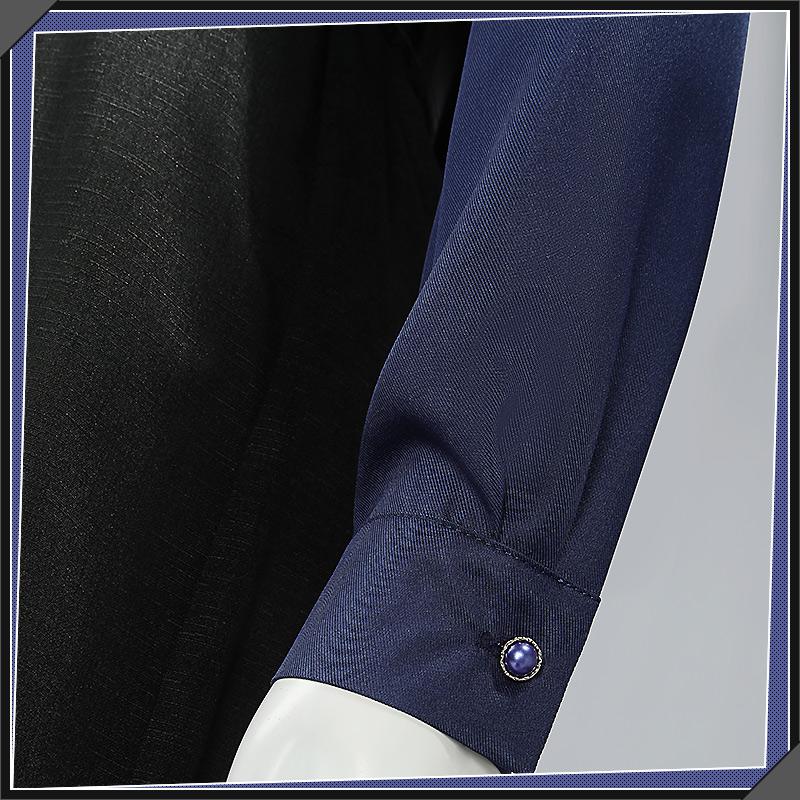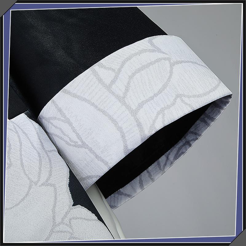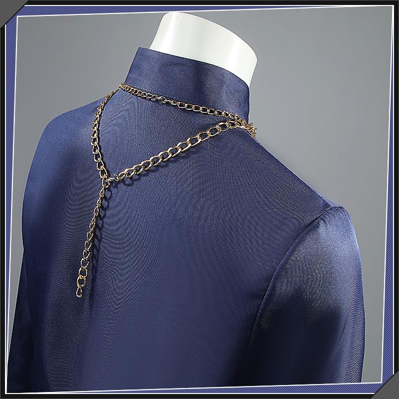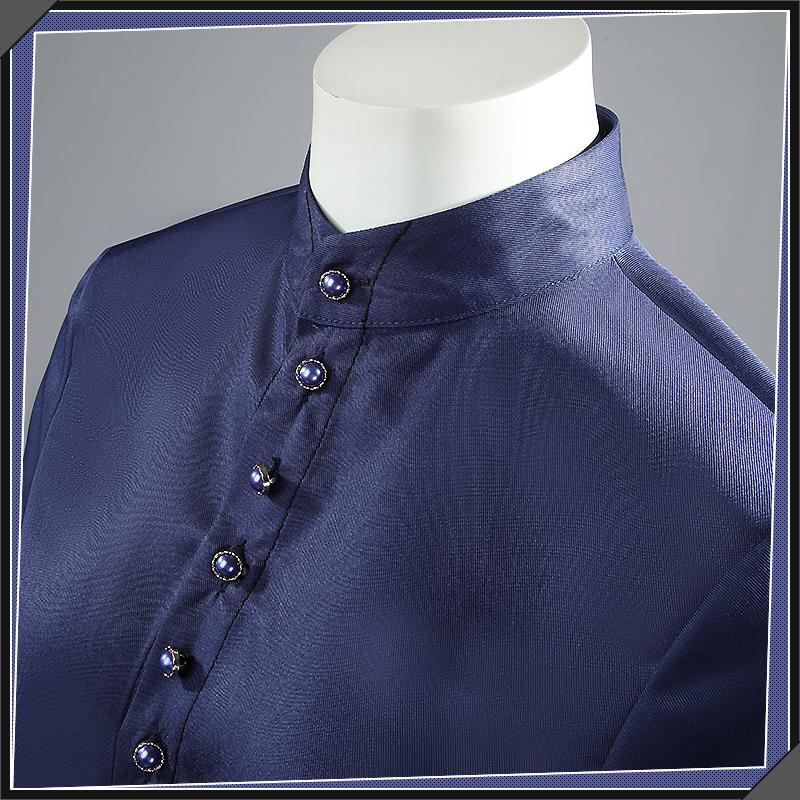 ポリエステルギャバで製作しています。立ち襟のデザインで、いい素材を使ったので通気性と着心地が高いです。