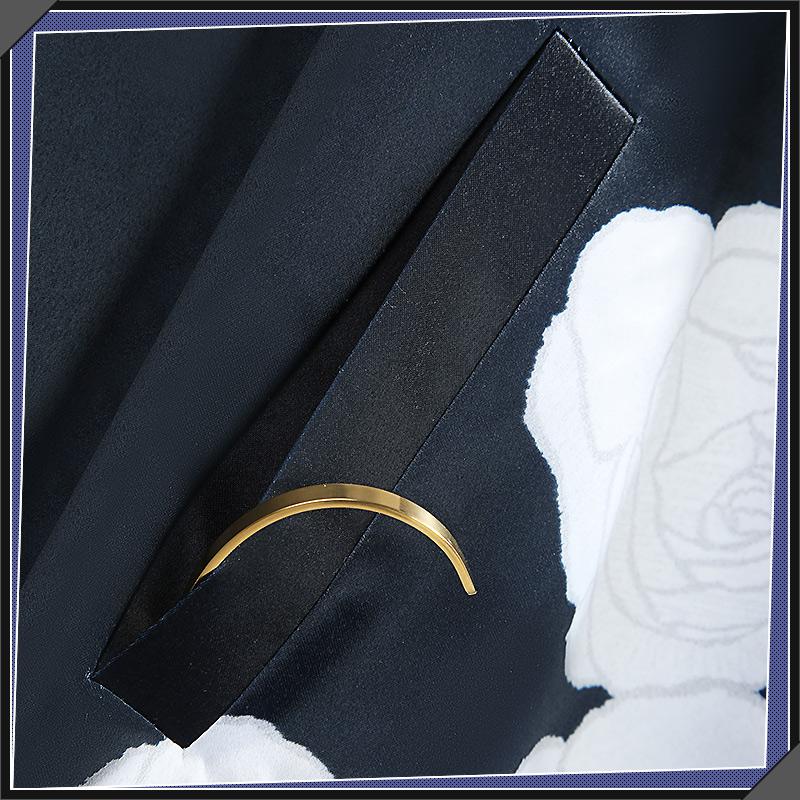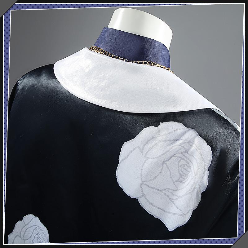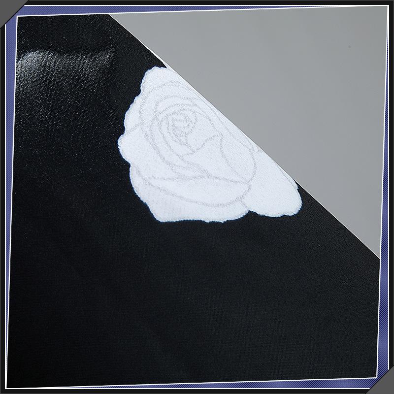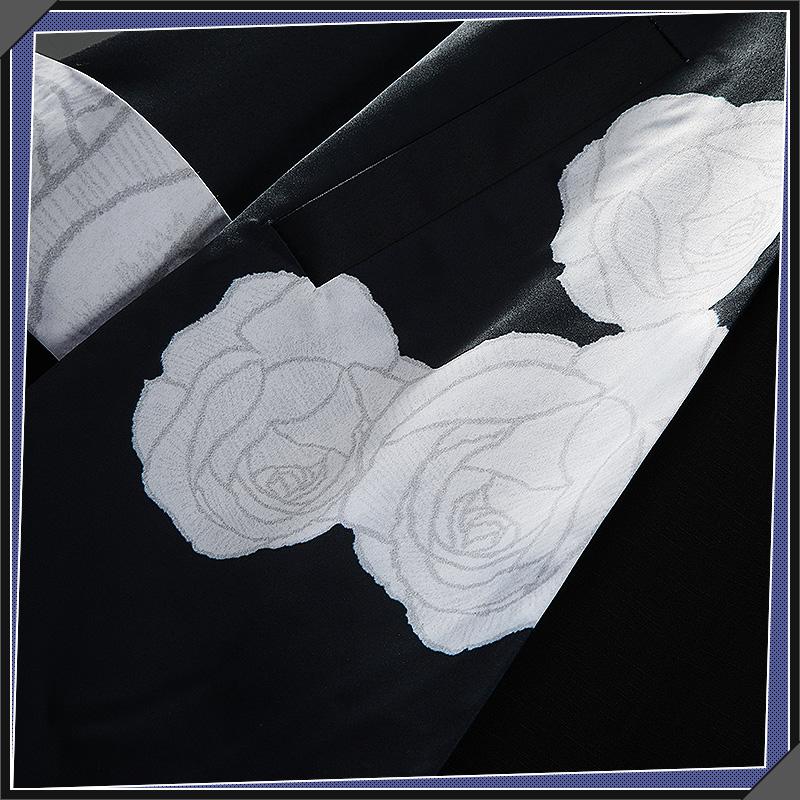 ブライダルサテンで製作しています。黒を基調として、薔薇の絵柄がプリントされて再現度が高いです。両サイドに本物のポケットが施されて便利です。