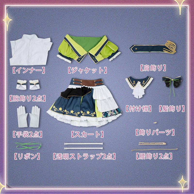 ジャケット、インナー、スカート、飾り物(付け襟、リボン、透明ストラップ2点、肩飾り、腕飾り2点、手袋2点、腰飾り2点、髪飾り、飾りパーツ)