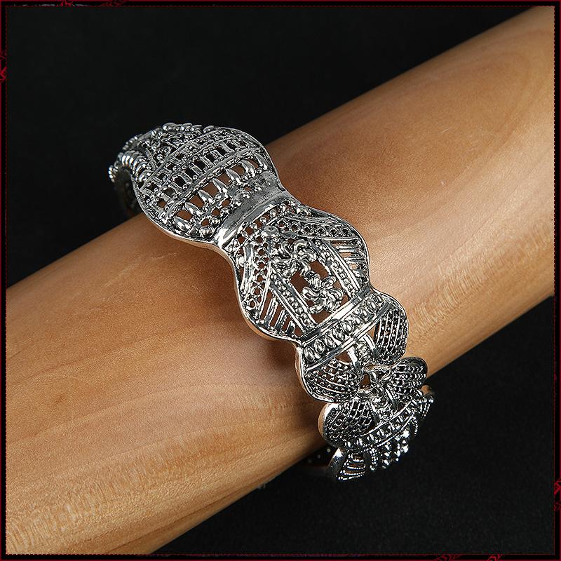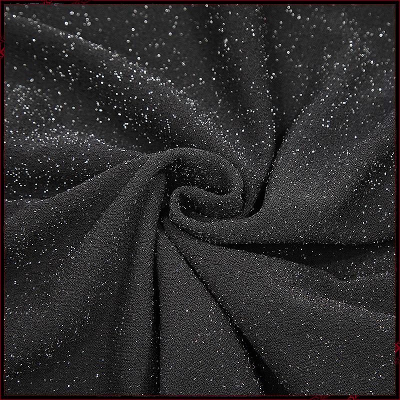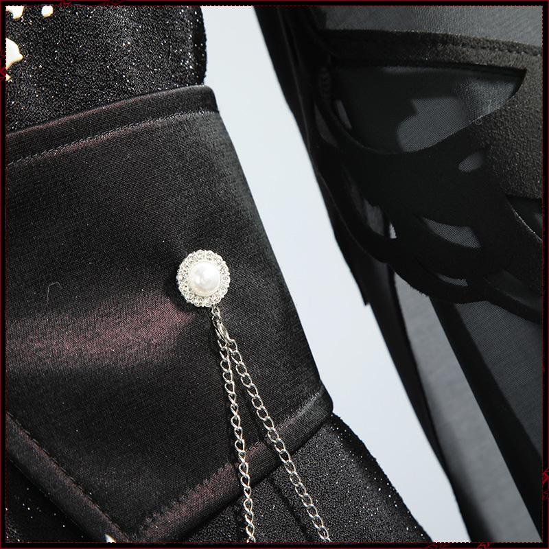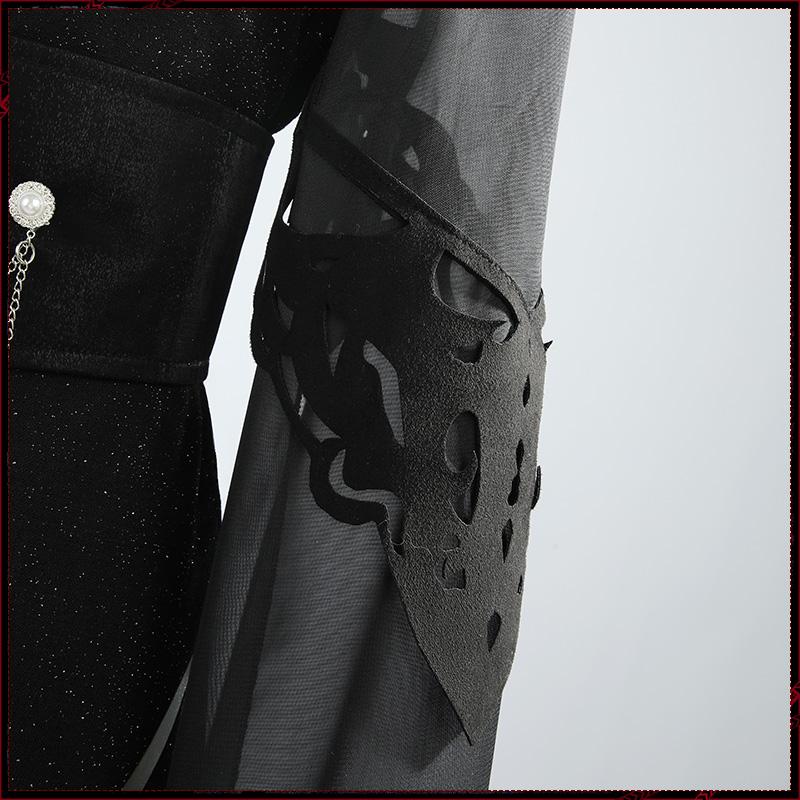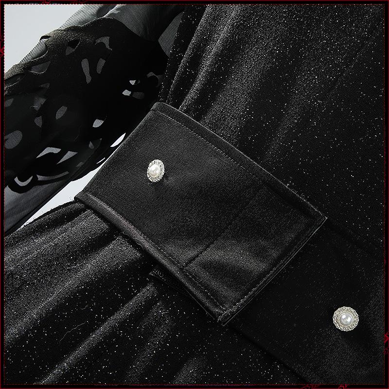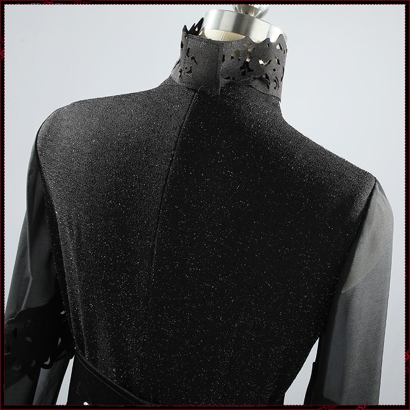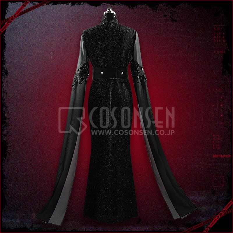 ラメニットとシフォンで製作しています。黒を基調として、ウェストは腰飾りで引き締めて、くびれたラインが綺麗に見えます。光沢のある生地を使ったので、高級感満々です。袖が肩から袖口まで広くなっていて、地面に引きずるほどの長さは印象的です。