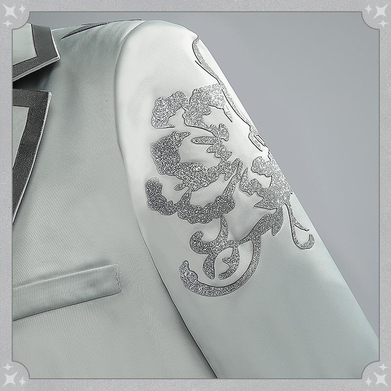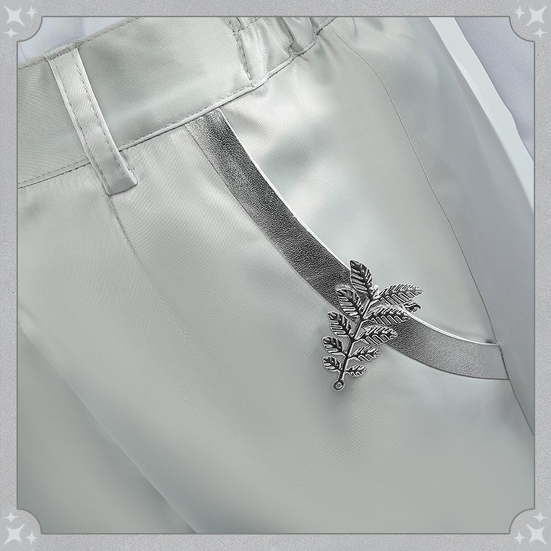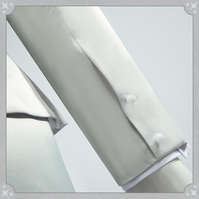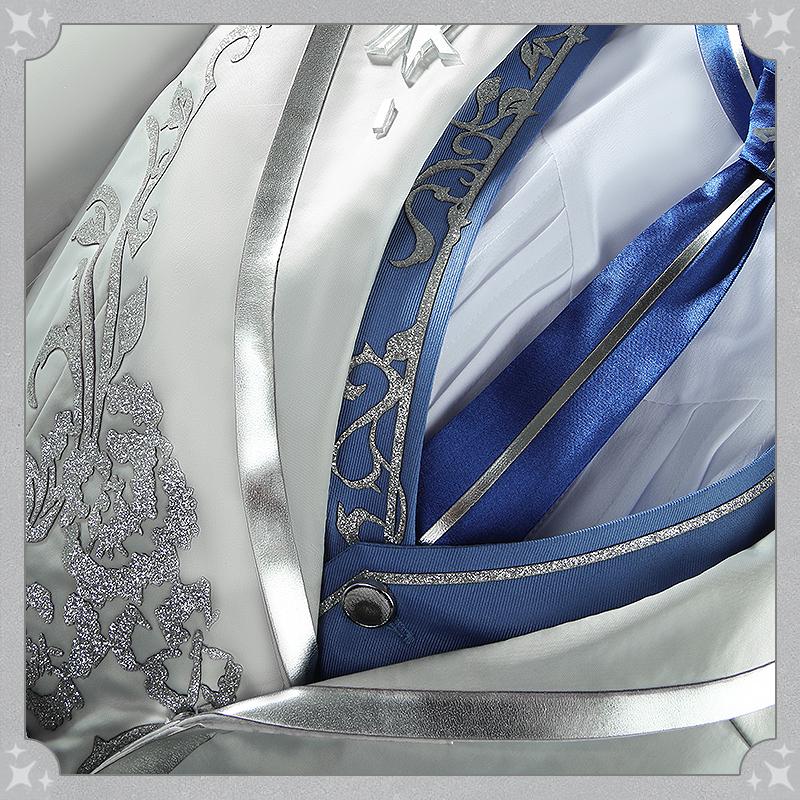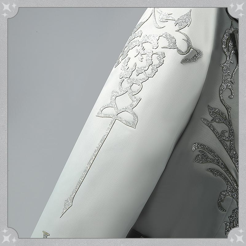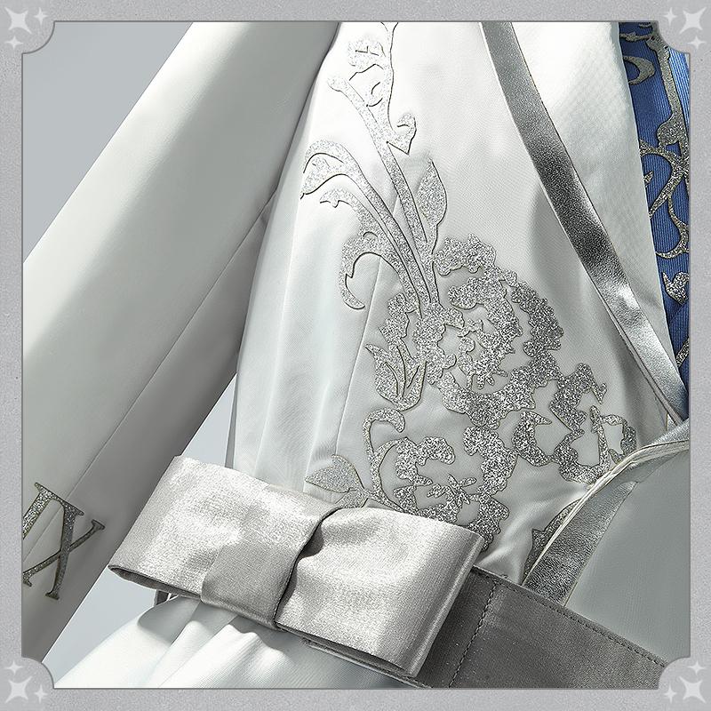 アセテートライクで製作しています。袖と胸先に銀色の合皮で絵柄を貼り付けて再現度が高いです。ウェスト部分は腰飾りで絞られ、スリムに見えスタイリッシュな一着です。