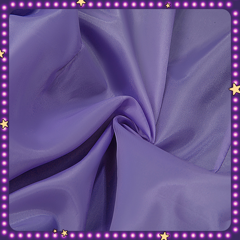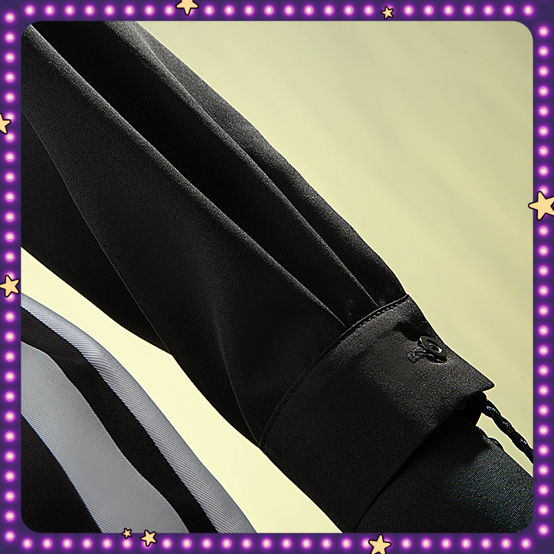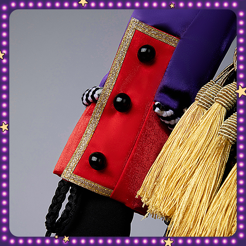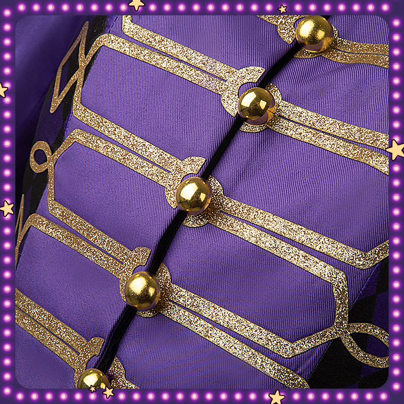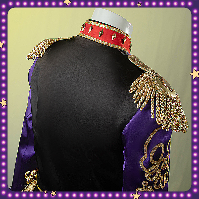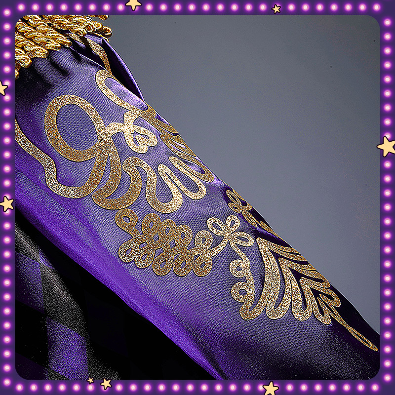 ポリエステルギャバとサテンで製作しています。紫と黒を基調として、両袖に原作に忠実する絵柄を貼り付けて再現度が高いです。肩の方に金色の肩章が施されてかっこよく見えます。