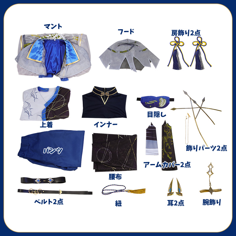 マント、上着、インナー、パンツ、飾り物(フード、耳2点、目隠し、房飾り2点、紐、腕飾り、アームカバー2点、腰布、ベルト2点、飾りパーツ2点)