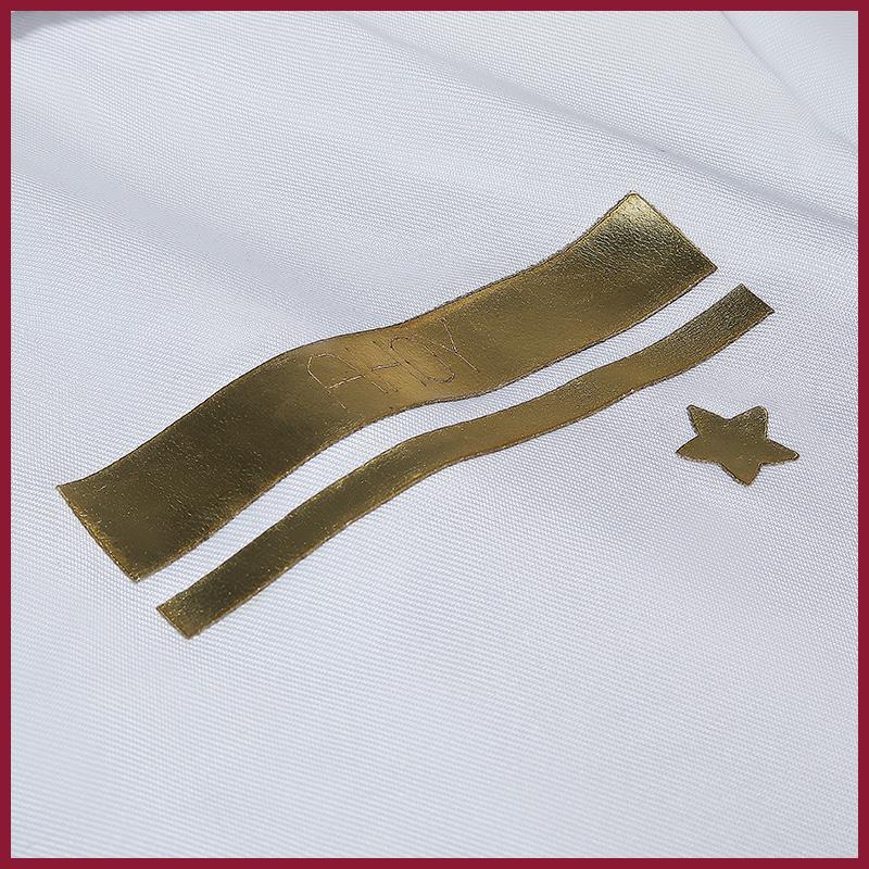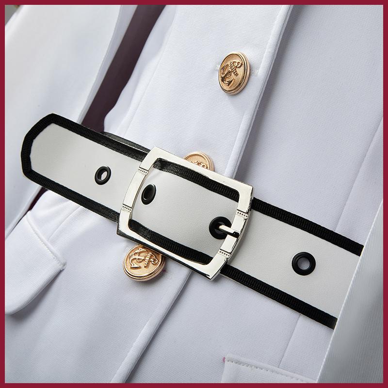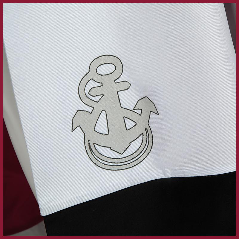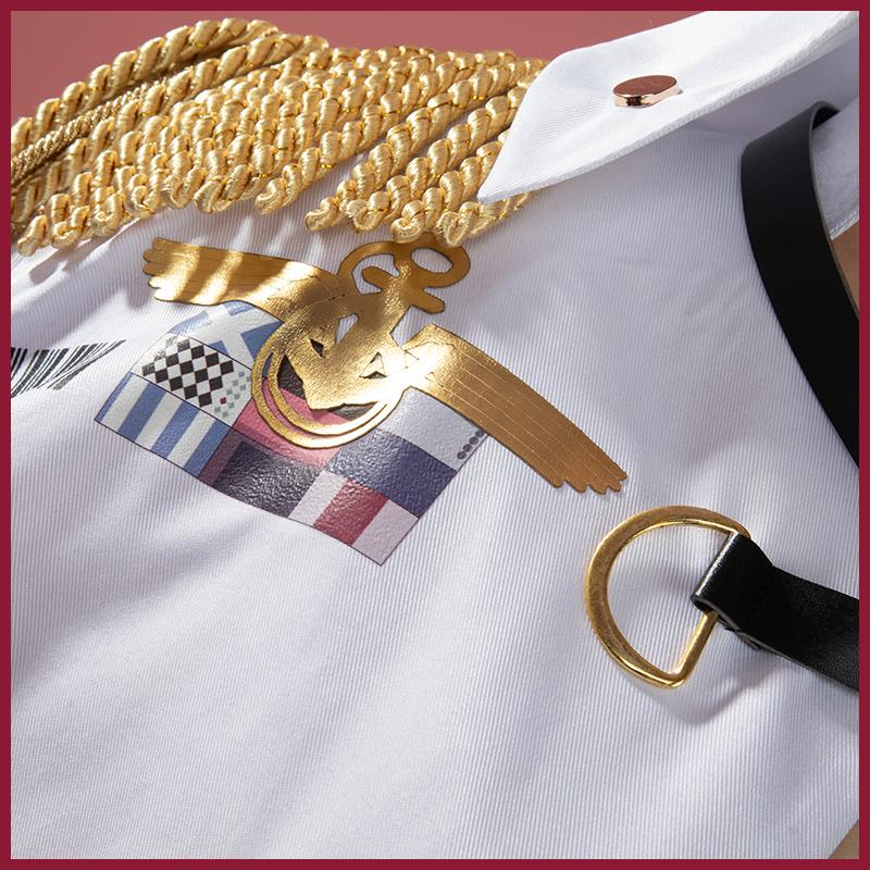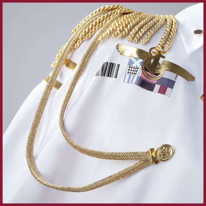 ポリエステルギャバで製作しています。首元のベルトは装飾と固定の役割を兼ね備えます。肩に紐飾りが施されて再現度が高いです。