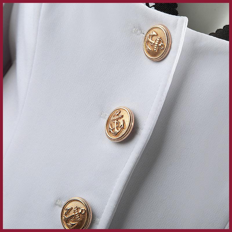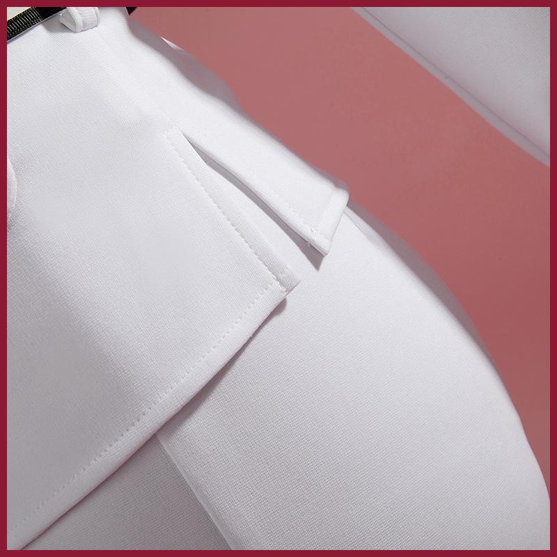 ニット生地で製作しています。白を基調として、フィット性に優れたジャケットです。胸先が広く開いていて、色っぽく見えます。