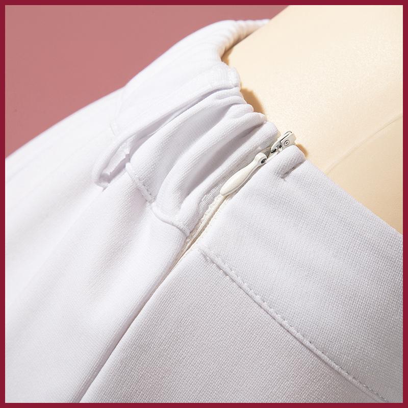 ニット生地で製作しています。真っ白なショートパンツで、いい素材を使ったので通気性と着心地が高いです。