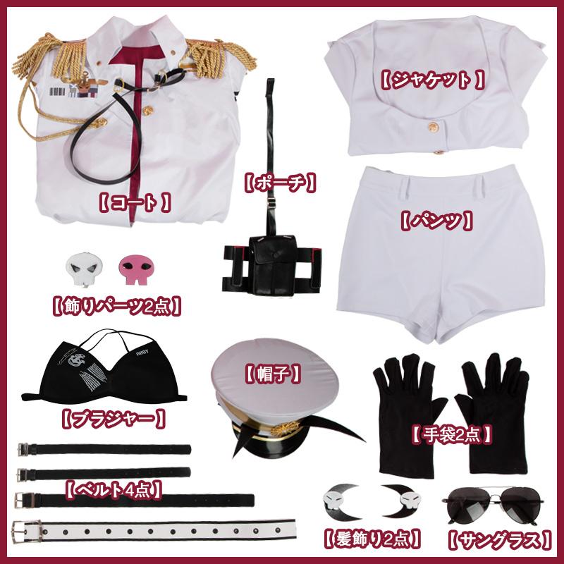 コート、ジャケット、ブラジャー、パンツ、飾り物(帽子、髪飾り2点、サングラス、ベルト4点、飾りパーツ2点、ポーチ、手袋2点)