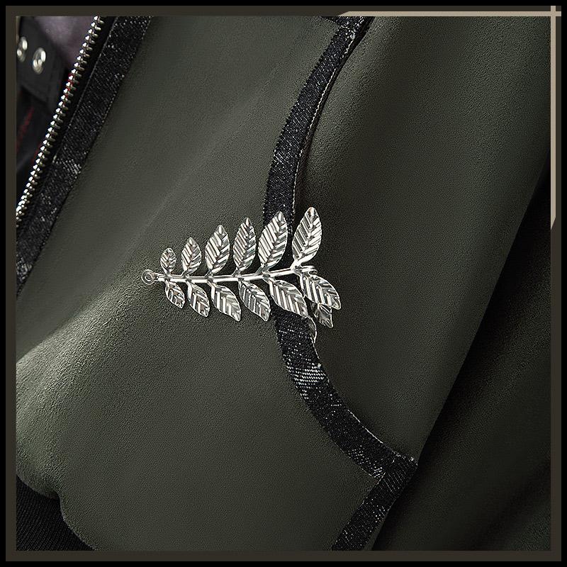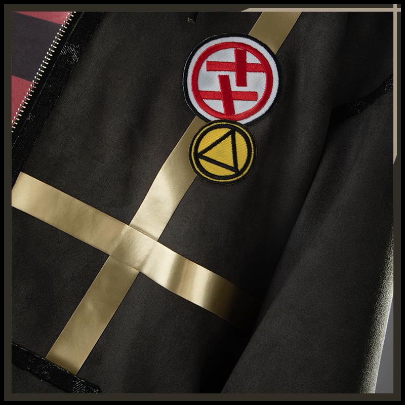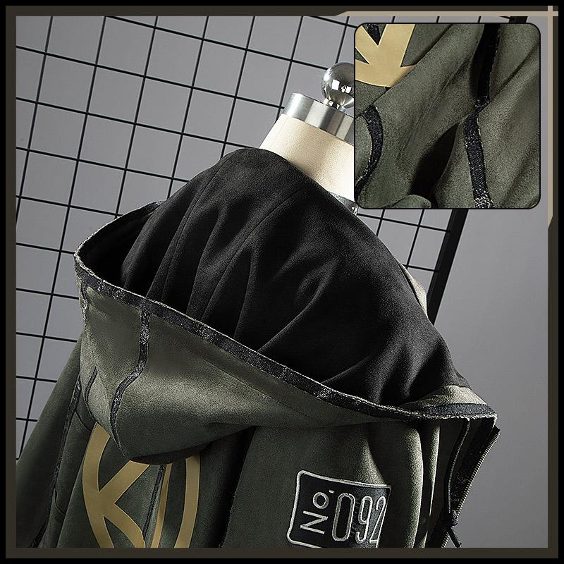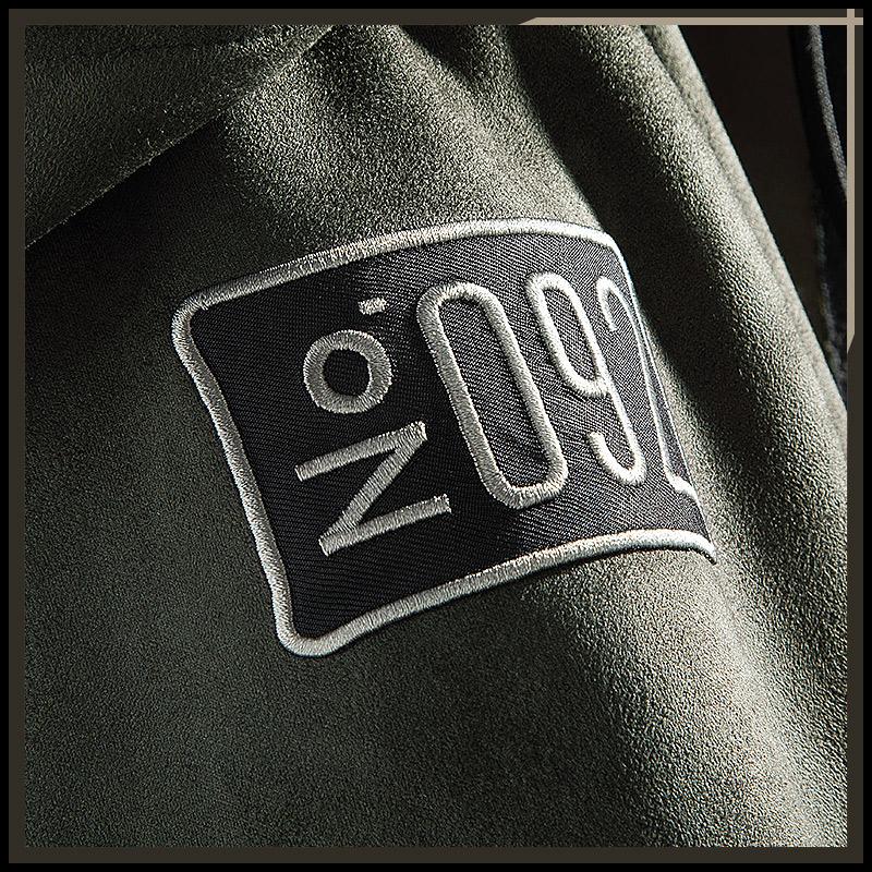 スエード生地で製作しています。フード付きのジャケットで、丈夫な素材を使って実用性が高いです。胸先と右袖に刺繡片を縫い付けてかっこいいです。