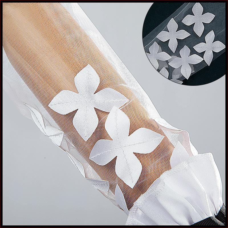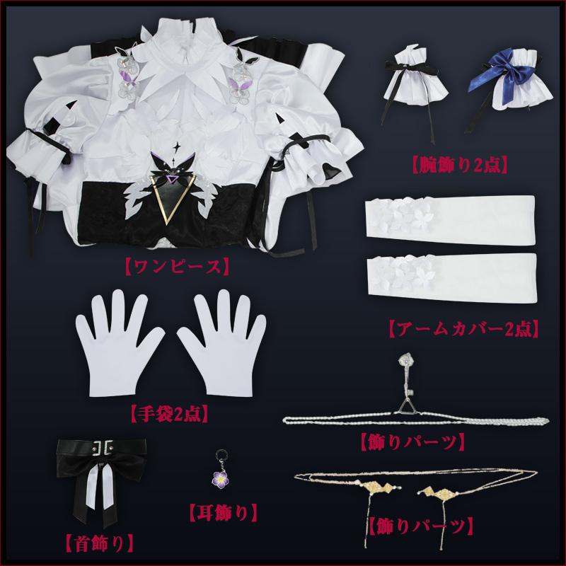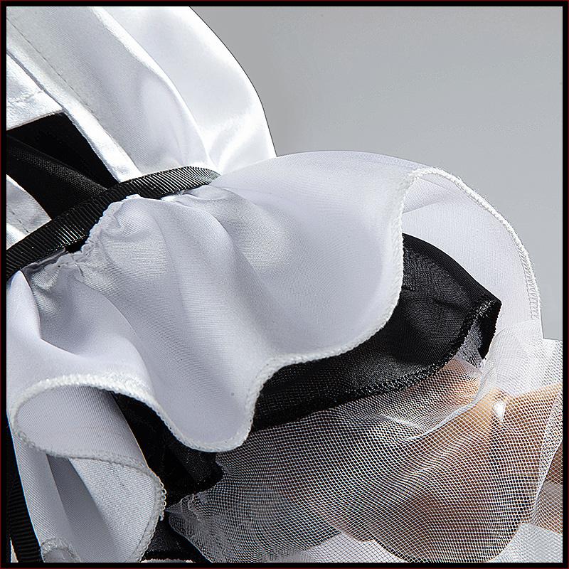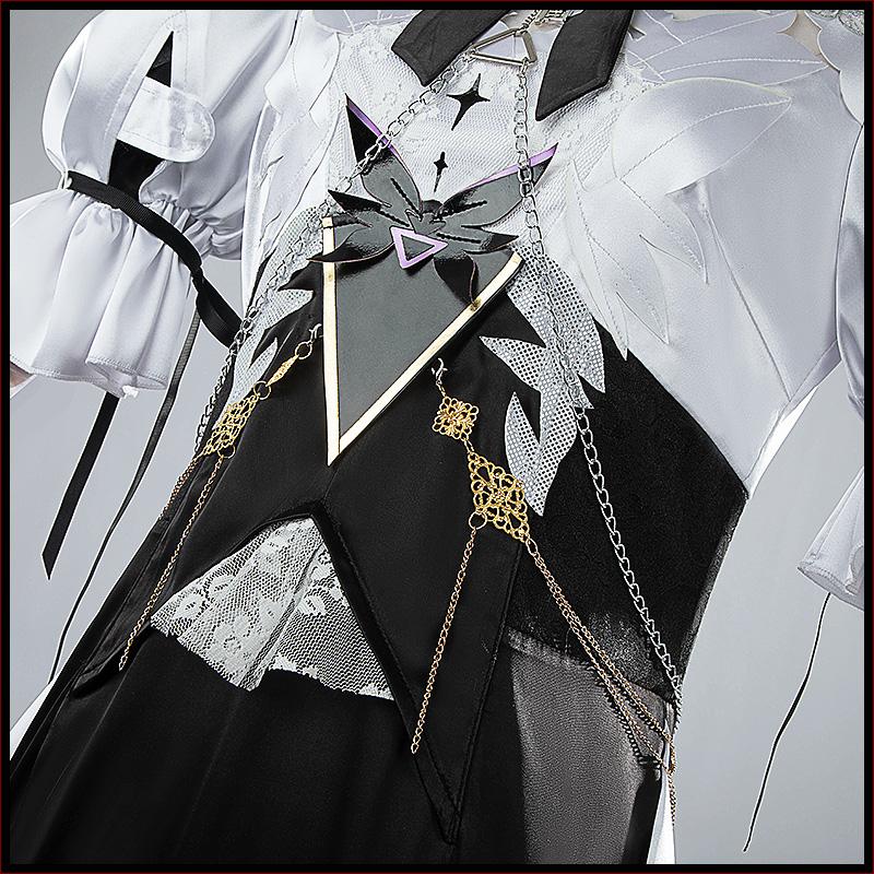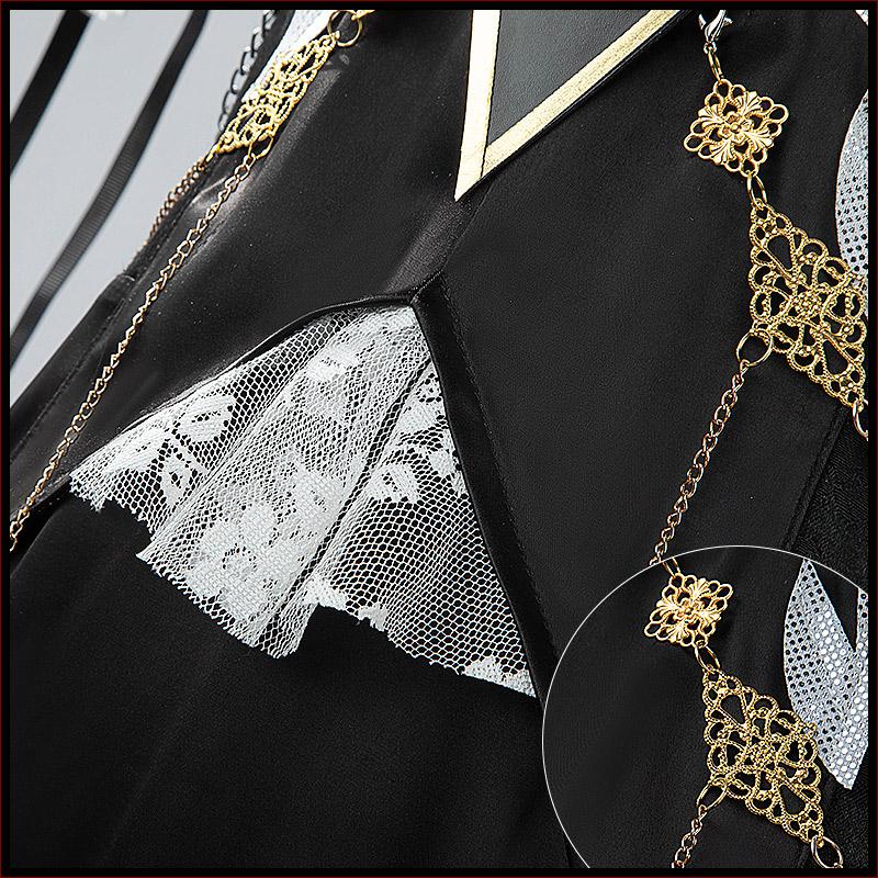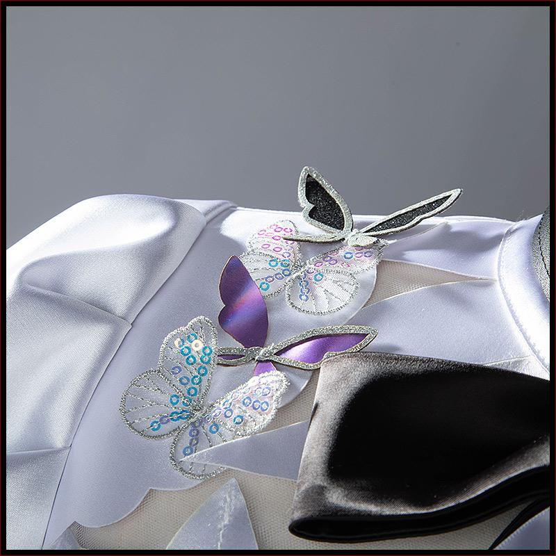 サテンで製作しています。黒と白を基調として、両肩に蝶々の飾りが飾って綺麗に見えます。繊細な透かしで胸元を華やかに彩ります。裾が五層構造で、フリルがたっぷり加工されて原作を忠実に再現しました。