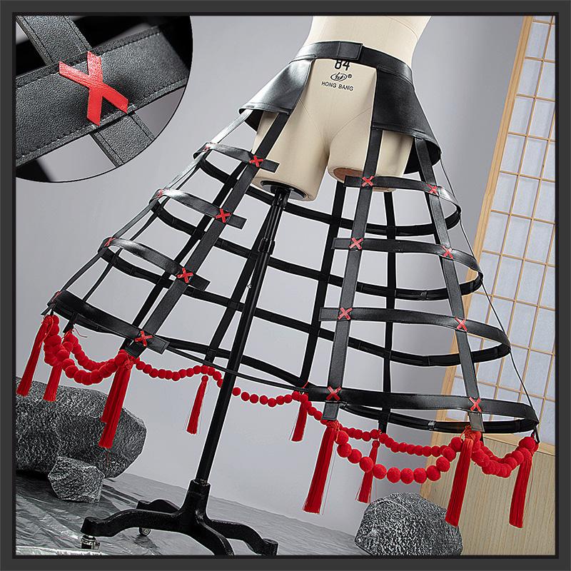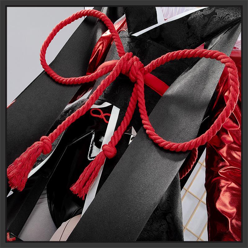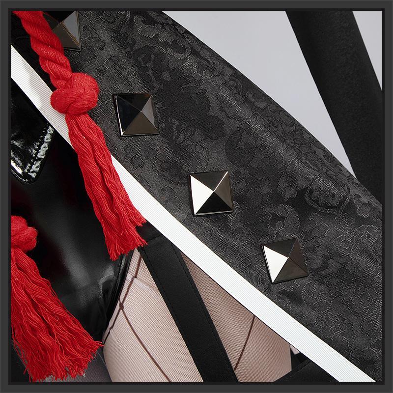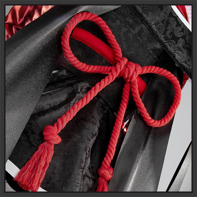 ジャガード生地とサテンで製作しています。黒を基調として、ウェストは帯で引き締め、くびれたラインが綺麗に見えます。周りに穴あきの飾り布を縫い合わせて再現度が高いです。