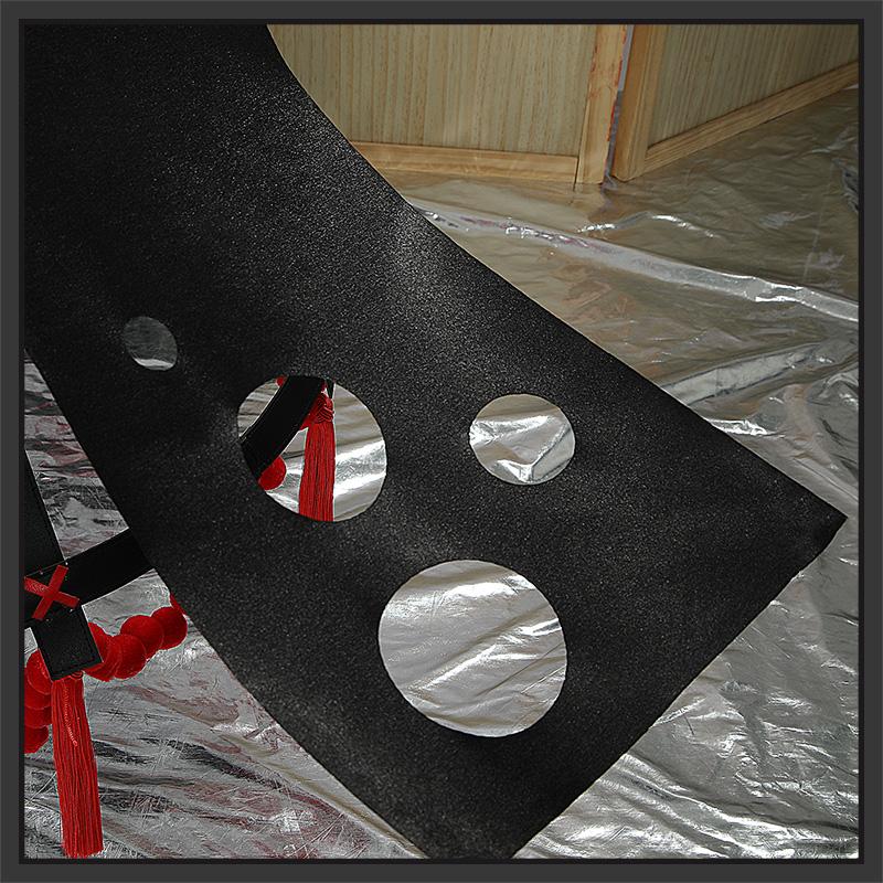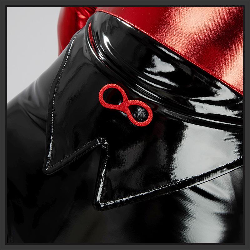 合皮で製作しています。赤と黒を組み合わせて、フィット性に優れたデザインです。後ろにチャックがついて、脱着が便利です。