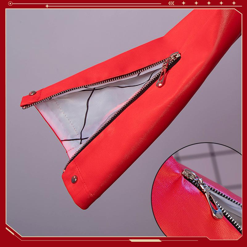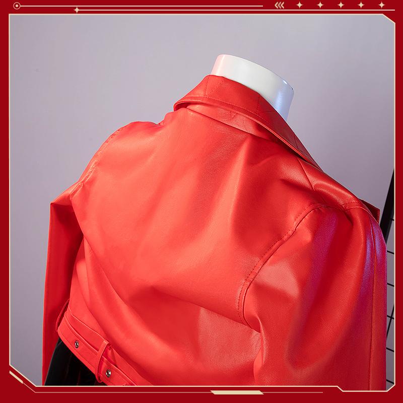 フェイクレザーで製作しています。赤を基調とした丈の短めなジャケットで、袖口のところにファスナーが施されて、細かいところまでこだわれて再現度が高いです。