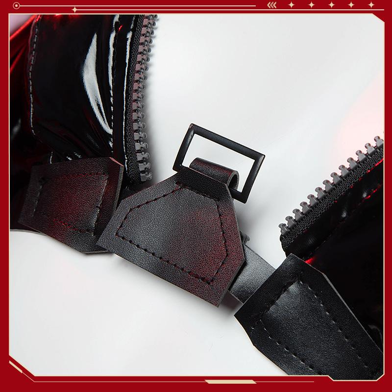 合皮とストレッチ生地で製作しています。黒地に銀色の絵柄が加工されて、原作を忠実に再現しました。左右の裾は非対称のデザインで個性的です。