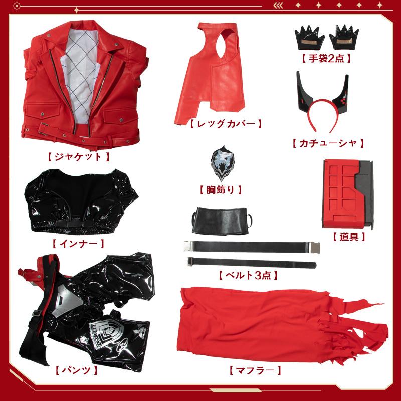 ジャケット、インナー、パンツ、飾り物(カチューシャ、マフラー、胸飾り、ベルト3点、レッグカバー、道具、手袋2点)