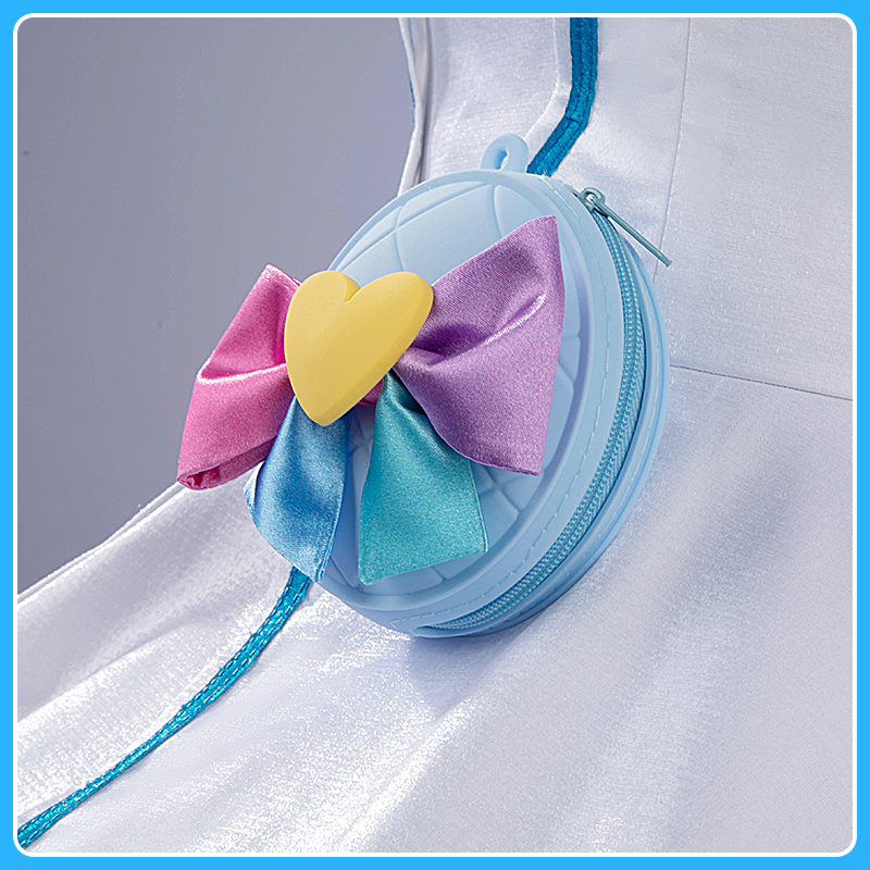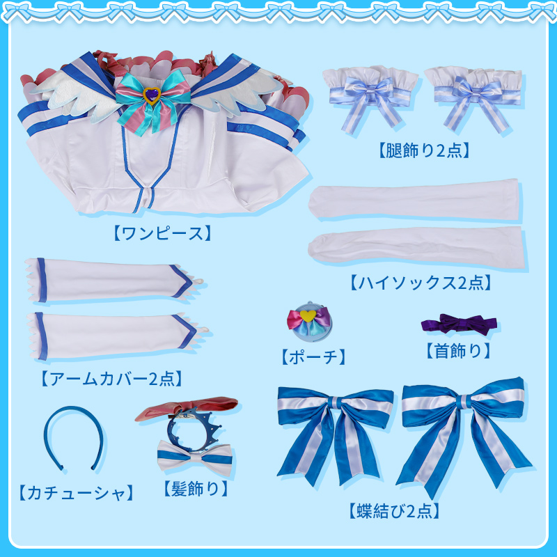 ワンピース、飾り物(髪飾り、カチューシャ、首飾り、アームカバー2点、蝶結び2点、ポーチ、腿飾り2点、ハイソックス2点)