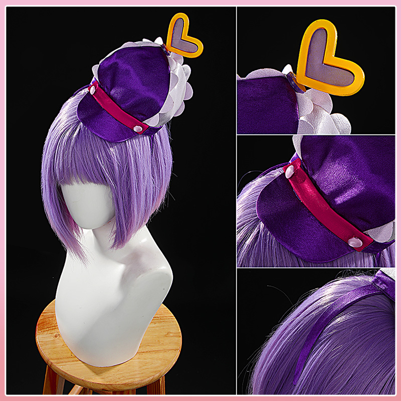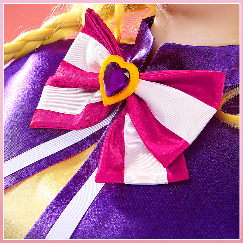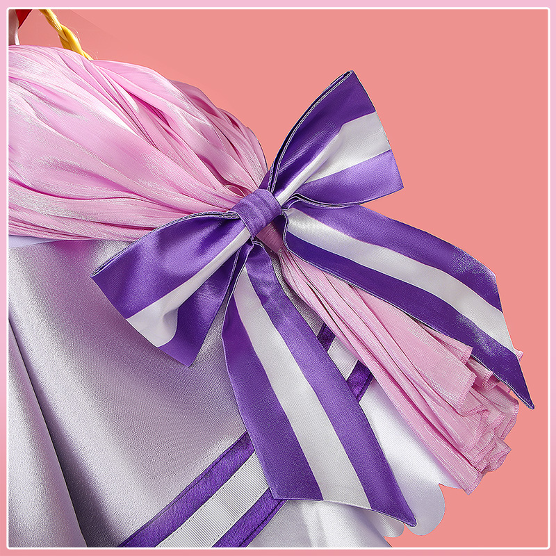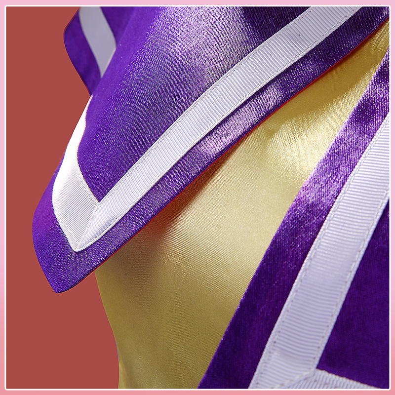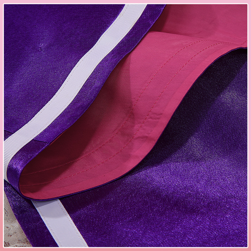 サテンで製作しています。紫を基調として、白い縁取りが施されて、詰め襟のデザインで原作を忠実に再現しました。