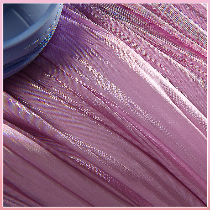 クリスタルサテンで製作しています。ノースリーブのデザインで、プリーツをたっぷり加工して、程よくフレア感があります。裾に蝶結びが飾られて可愛く見えます。