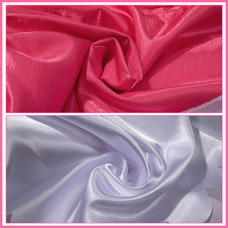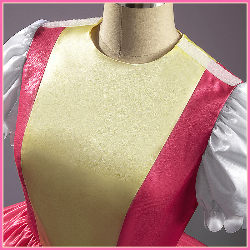 サテンと光沢布で製作しています。両サイドに蝶結びが飾られて綺麗に見えます。裾の部分は多重プリーツでふわふわ可愛いです。後ろにチャックがついて脱着が便利です。
