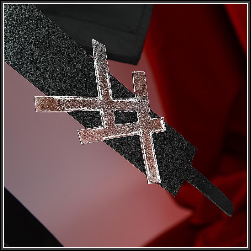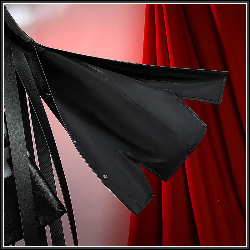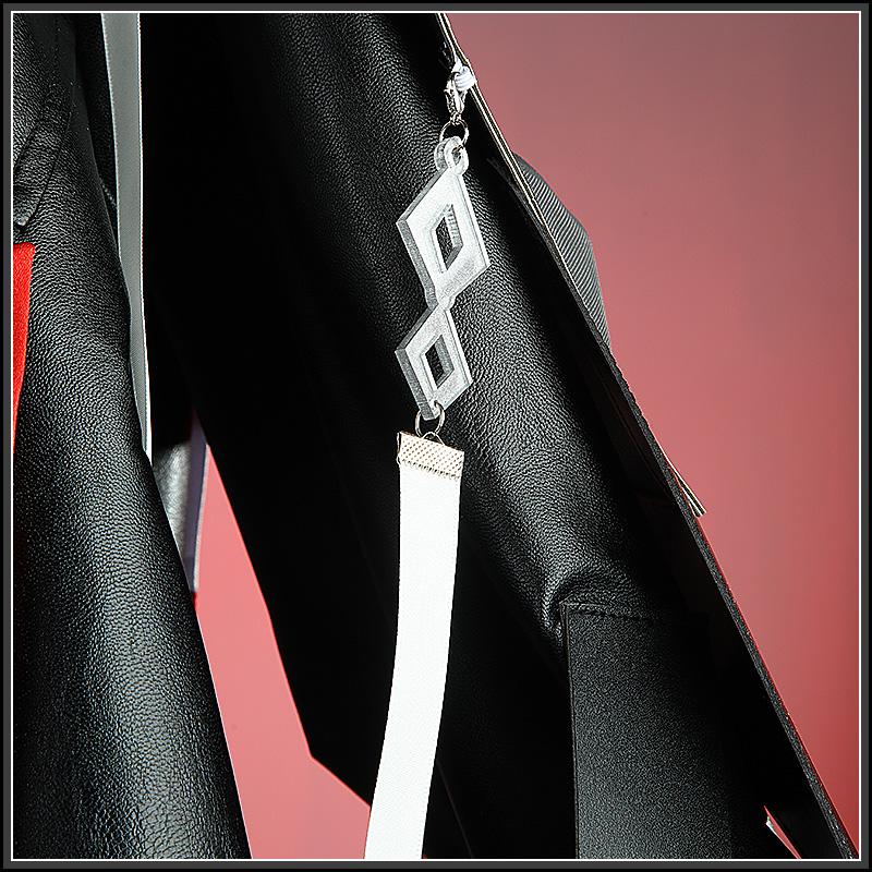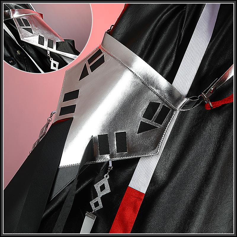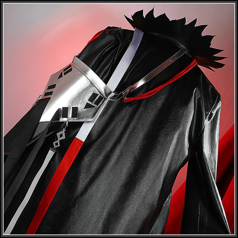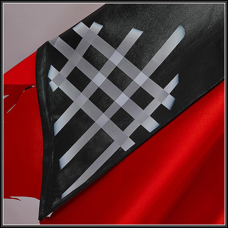 合皮で製作しています。黒を基調として、格子縞の柄が飾られて原作を忠実に再現しました。炎のような襟があって、かっこよく見えます。