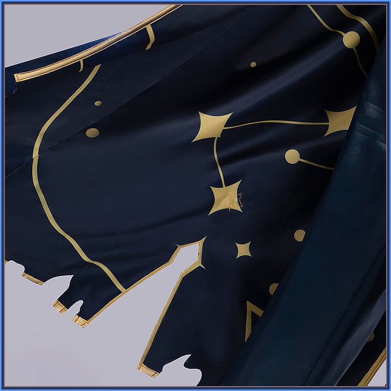 光沢布とサテンで製作しています。フード付きのマントです。紺色を基調として、裏地に星象の絵柄がプリントされてかっこいいです。