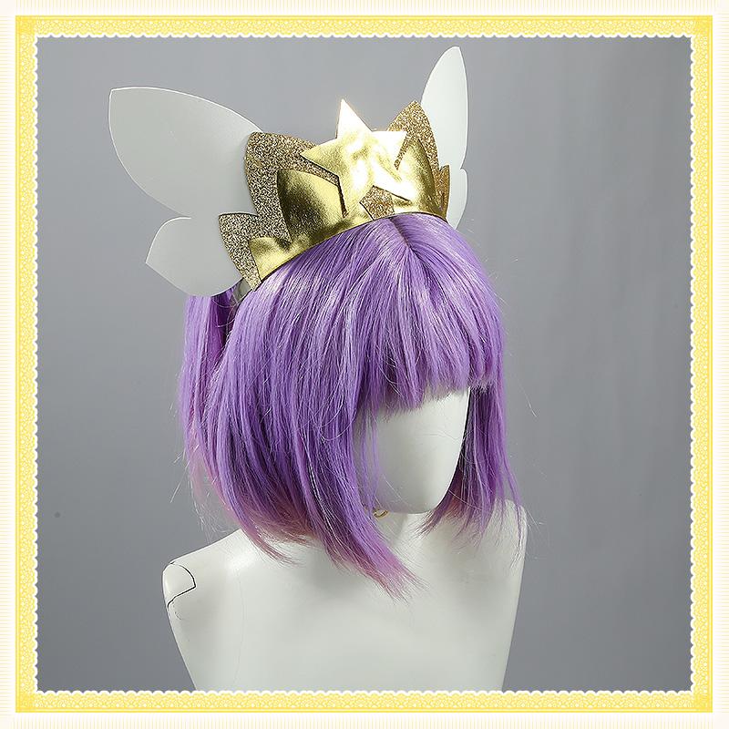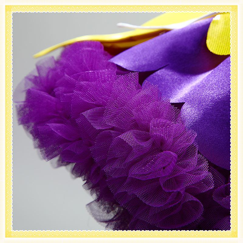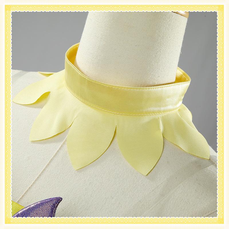 主にサテンで製作しています。黄と白と紫を基調として、オフショルダーのワンピースです。不規則な裾があって原作を忠実に再現しました。パニエを重ね着して、ボリューム感たっぷりなスカートできれいです。