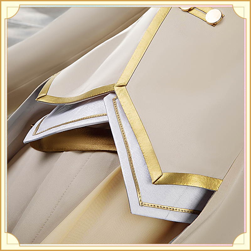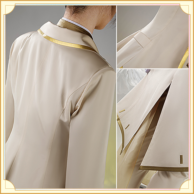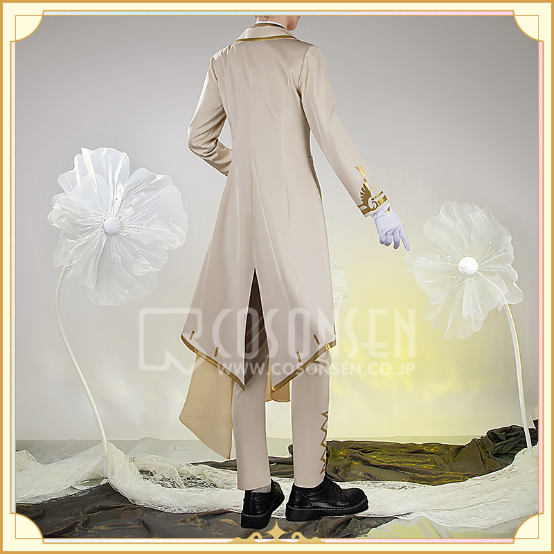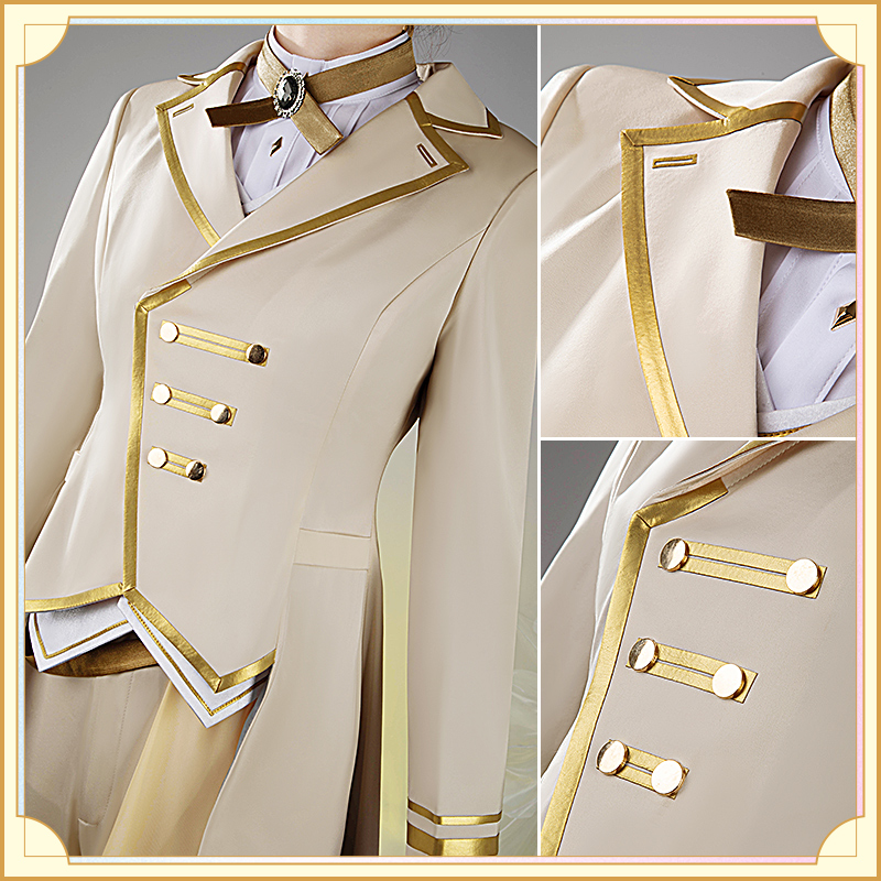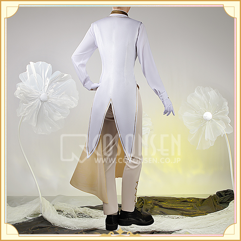 ウォールサテンで製作しています。白を基調とした燕尾服です。襟と袖口に金色の合皮で縁取りされていて華麗です。