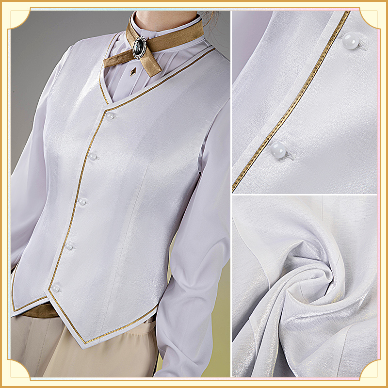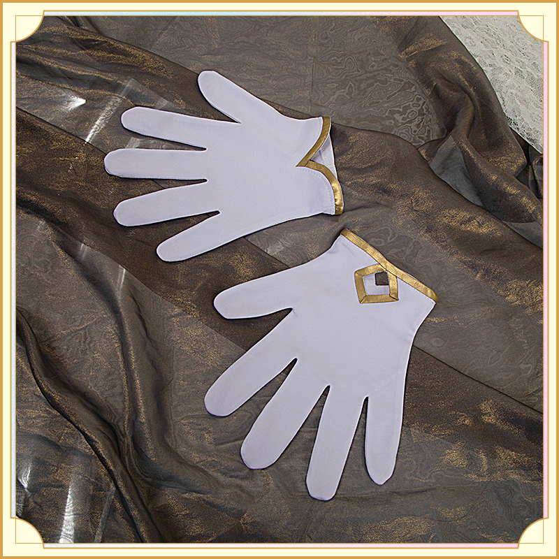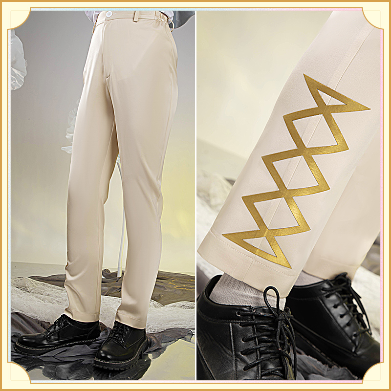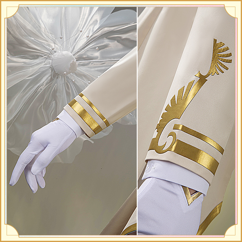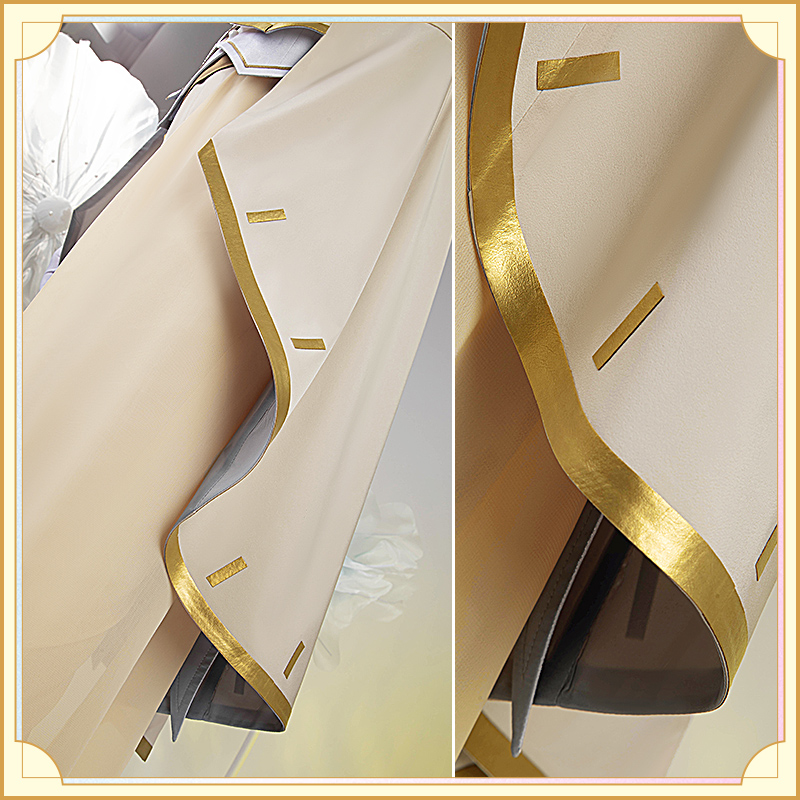 ウォールサテンで製作しています。白を基調とした燕尾服です。襟と袖口に金色の合皮で縁取りされていて華麗です。