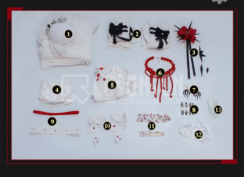 ワンピース、パンツ、飾り物(スリーブ2点、髪飾り4点、付け襟、ネックレス、耳飾り2点、ネイル10点、腿飾り3点、腕飾り2点、腰飾り2点)