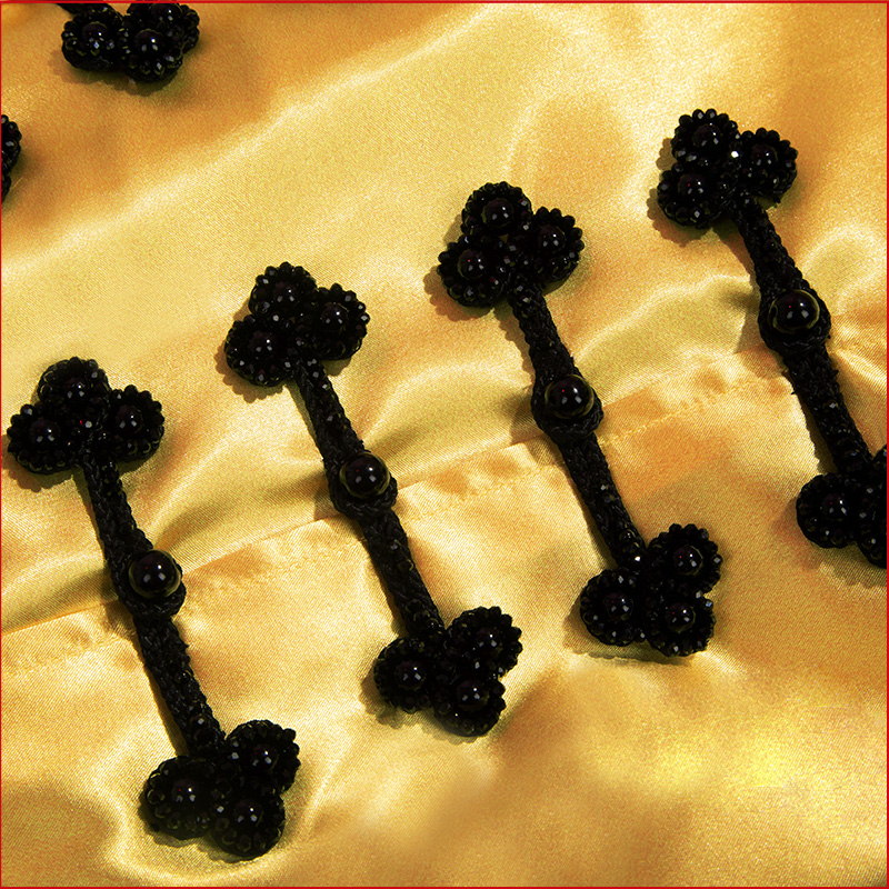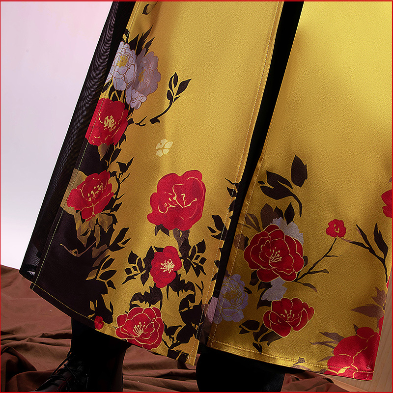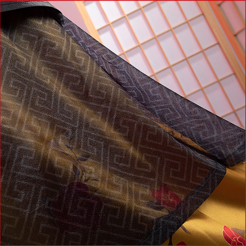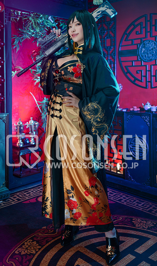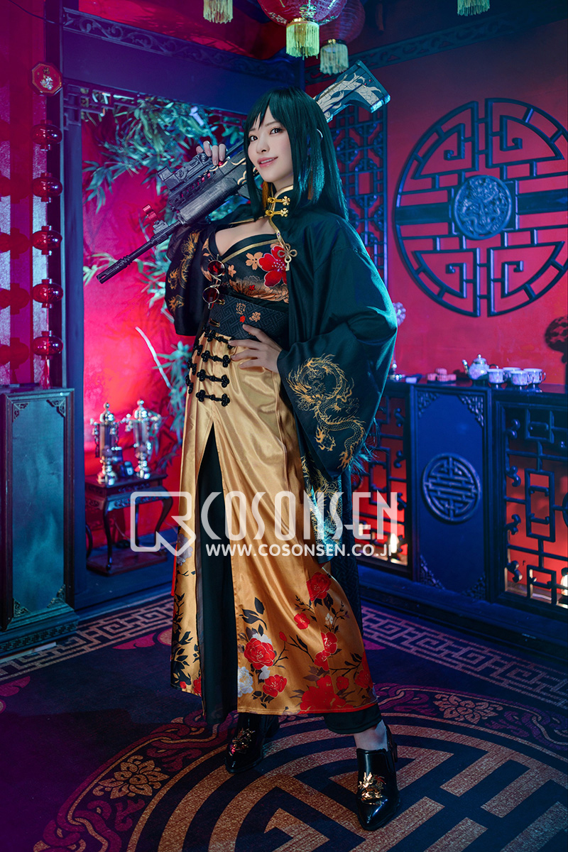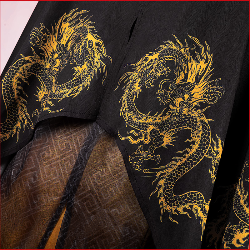 ヘリンボーン生地で製作しています。黒を基調として、袖口と裾に金龍の絵柄がプリントされて再現度が高いです。