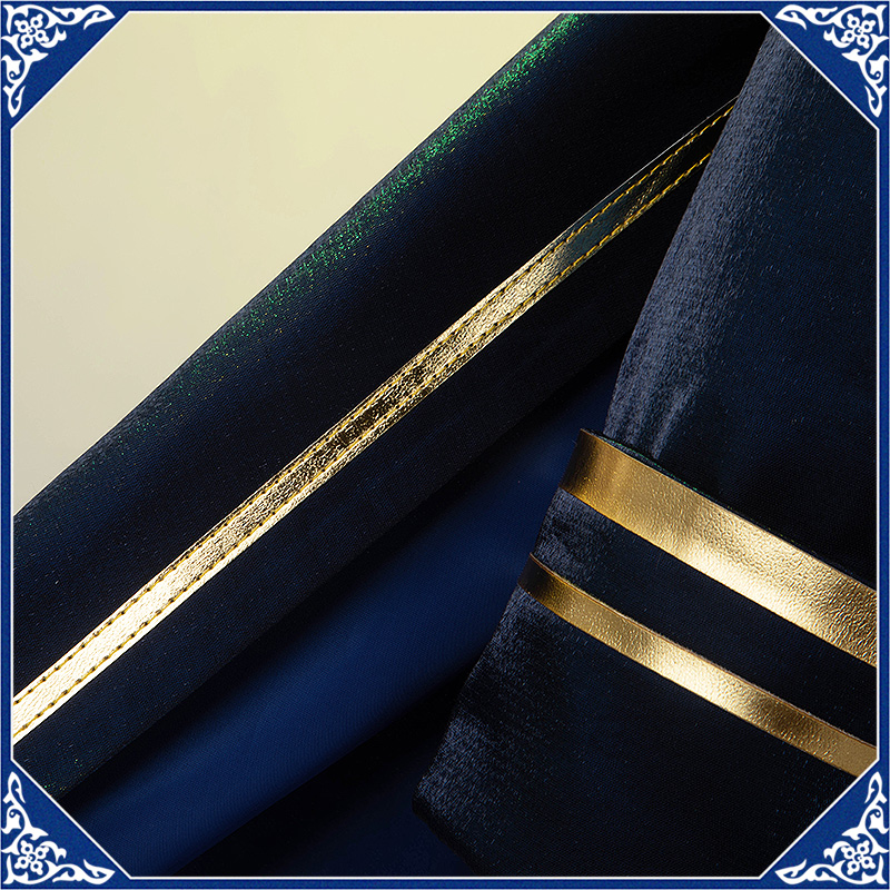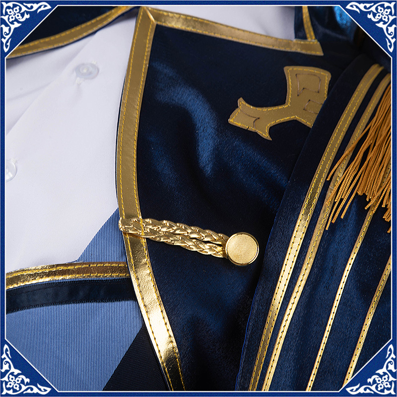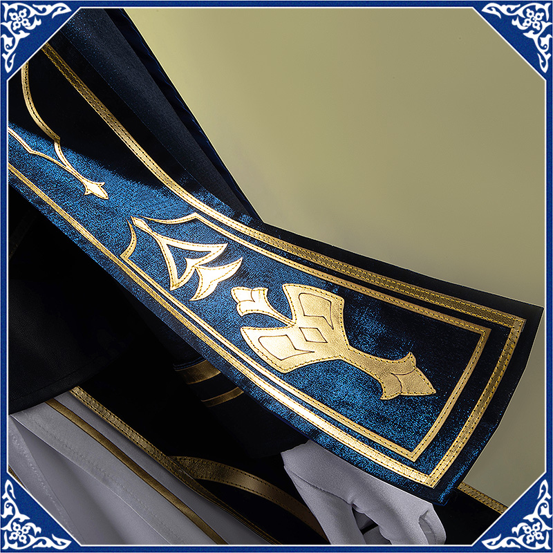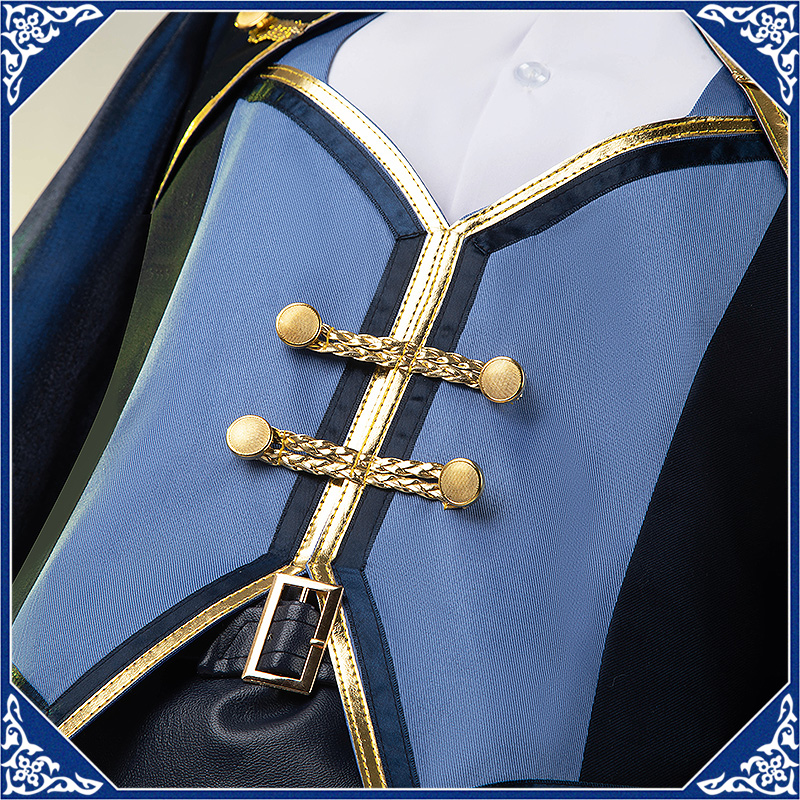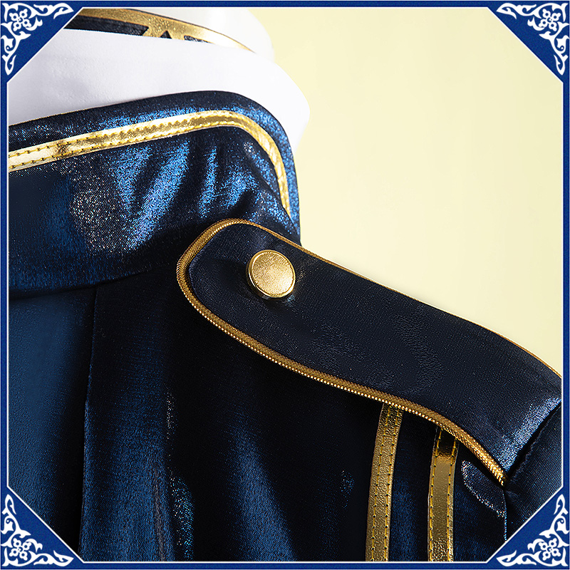 光沢布で製作しています。マント付きの上着で、原作のユニークなデザインを完璧に再現しました。襟と袖口に金色の合皮で縁取りされて華やかです。