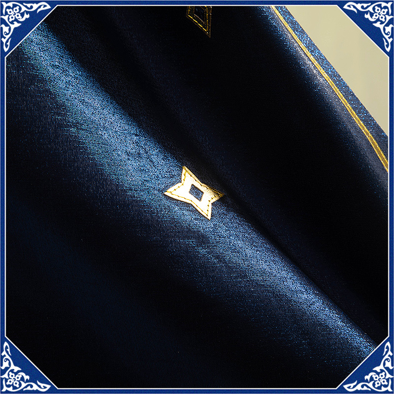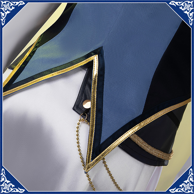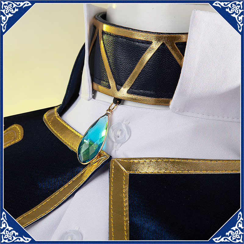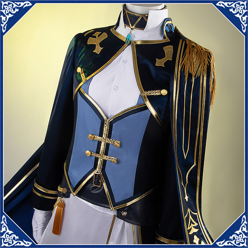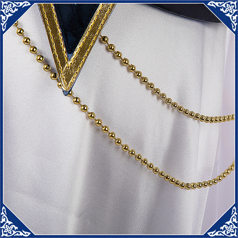 光沢布で製作しています。マント付きの上着で、原作のユニークなデザインを完璧に再現しました。襟と袖口に金色の合皮で縁取りされて華やかです。