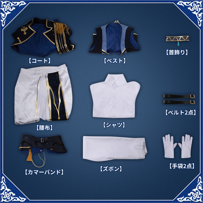 コート、ベスト、シャツ、ズボン、飾り物(首飾り、手袋2点、腰布、カマーバンド、ベルト2点)