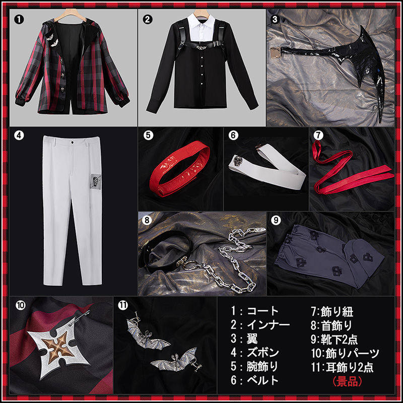 コート、インナー、ズボン、飾り物(首飾り、飾り紐、腕飾り、翼、ベルト、飾りパーツ、靴下2点)