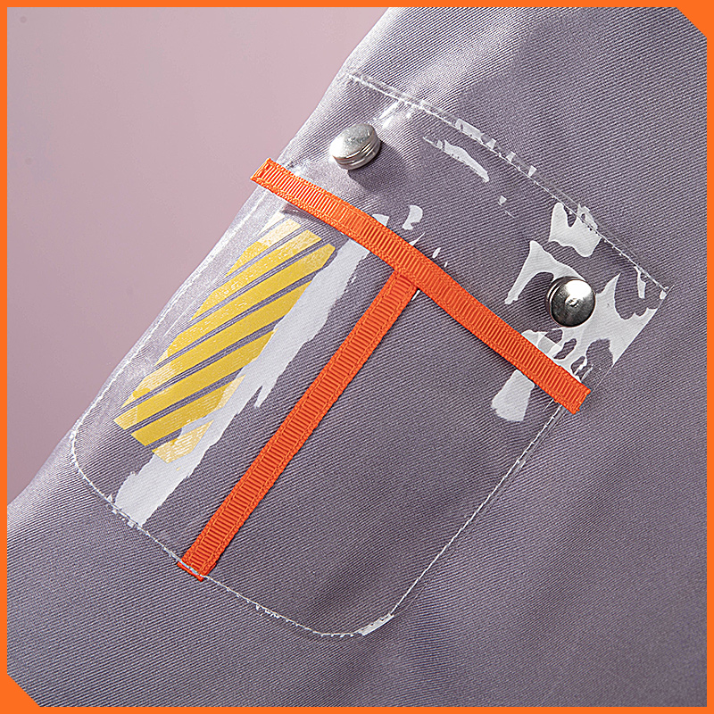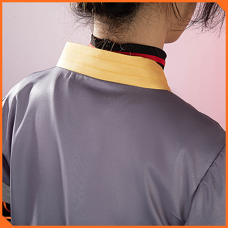 ポリエステルギャバで製作しています。和風の上着です。襟にマジックテープが施されて脱着が便利です。