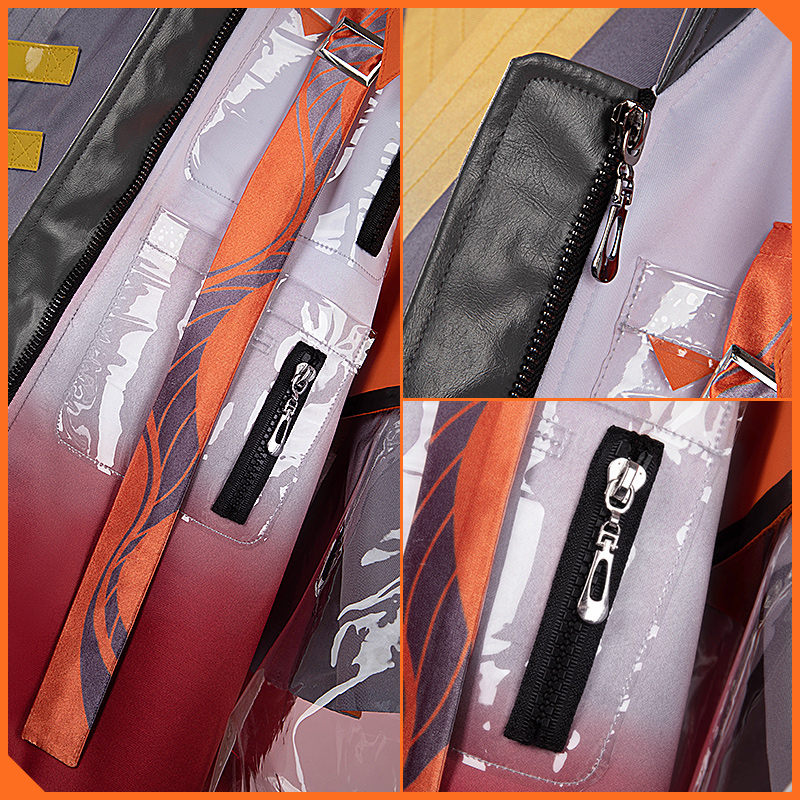 主にダンボールニット生地で製作しています。フード付きのジャケットです。両袖は透明生地を使って再現度が高いです。