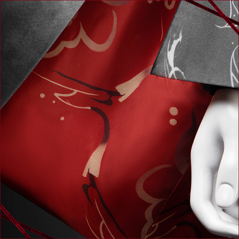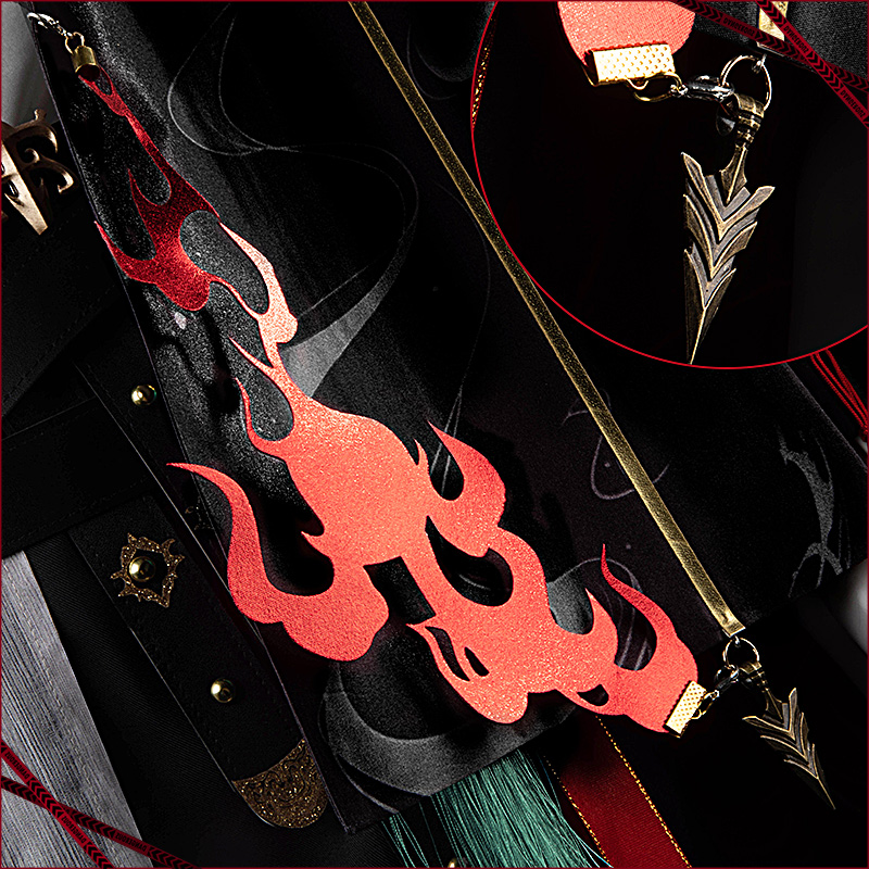 サテンで製作しています。黒を基調として、襟に金色の縁取りが施されて、合皮で炎のような絵柄が飾られて原作を忠実に再現してかっこよく見えます。