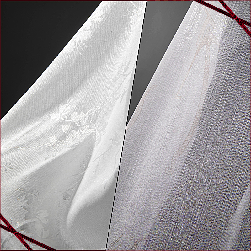 ヘリンボーンで製作しています。白を基調として、詰め襟の上着で、うっすら銀色の模様が見えてユニークなデザインで印象的です。