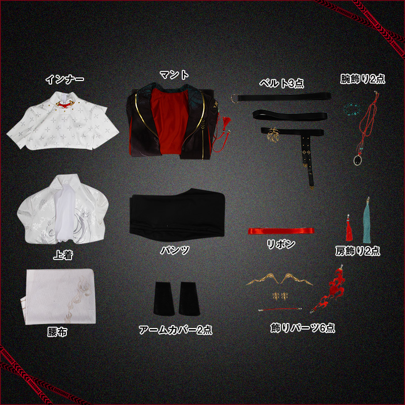 マント、上着、インナー、パンツ、飾り物(房飾り2点、腕飾り2点、ベルト3点、アームカバー2点、飾りパーツ6点、リボン、腰布)