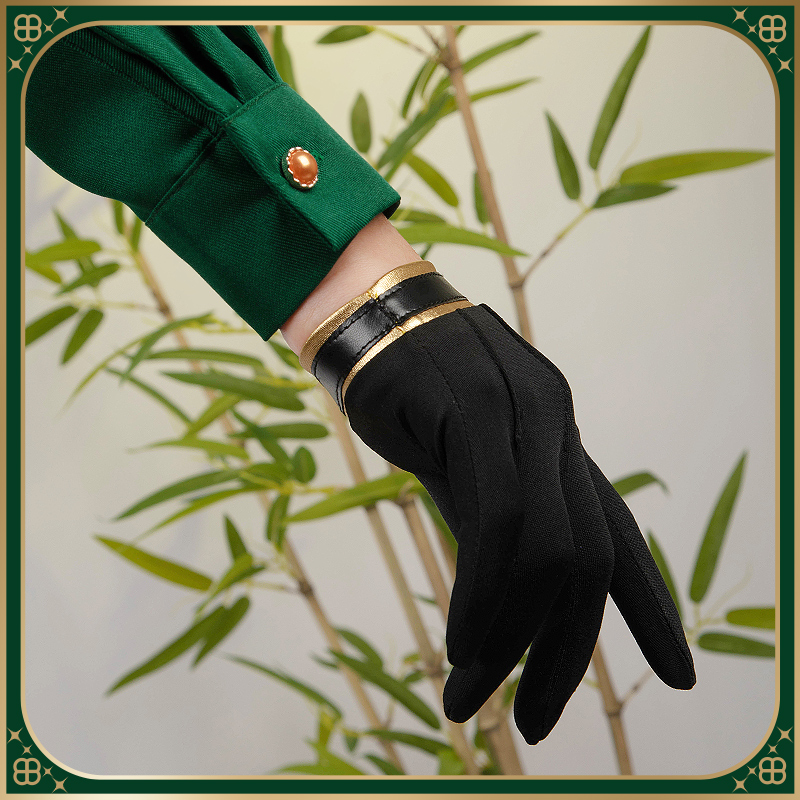 光沢布で製作しています。華やかな上着で、金色の縁取りが施されて再現度が高いです。