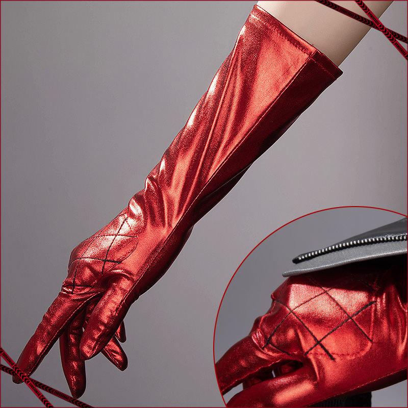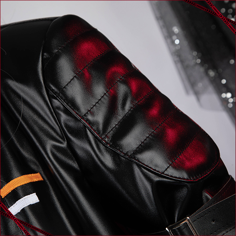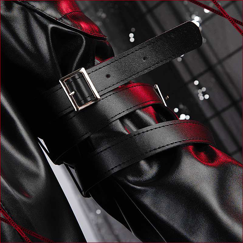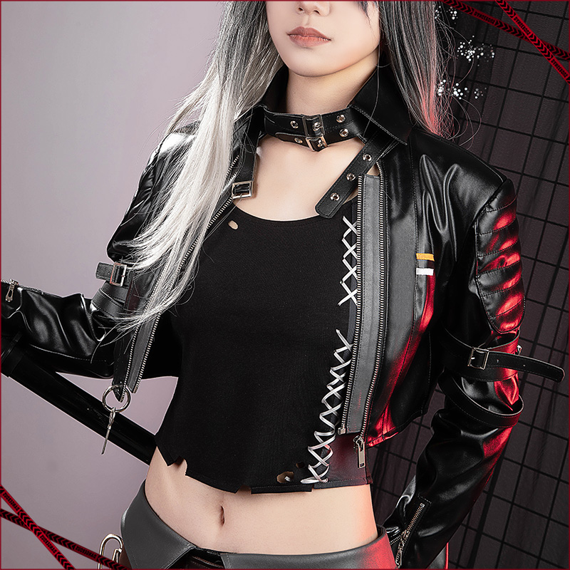 PUレザーで製作しています。黒を基調として、丈の短いジャケットです。袖口のところにファスナーが飾られて再現度が高いです。