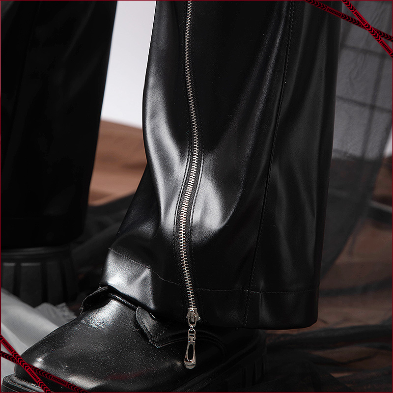 ストレッチレザーで製作しています。ウエストのところに灰色の折り返しが施されて、腰周りがスッキリしていてかっこよく見えます。
