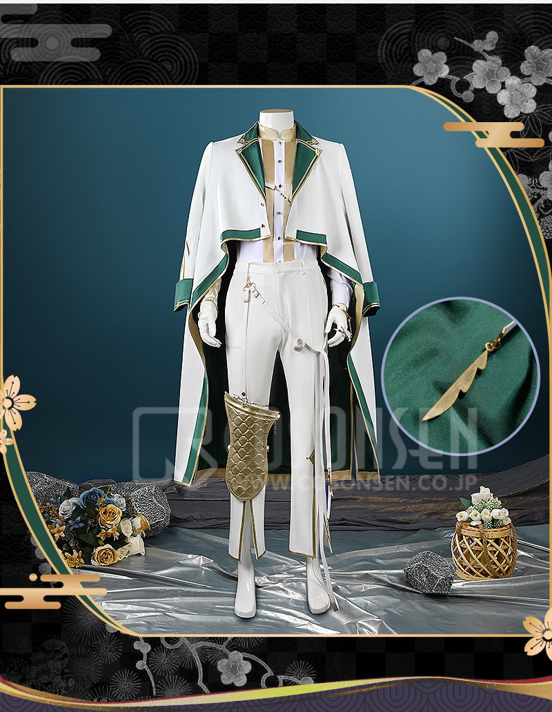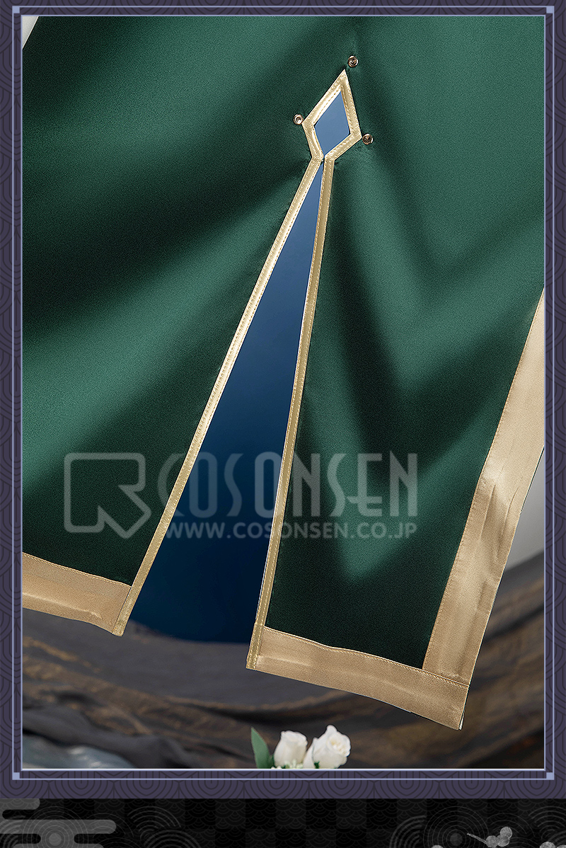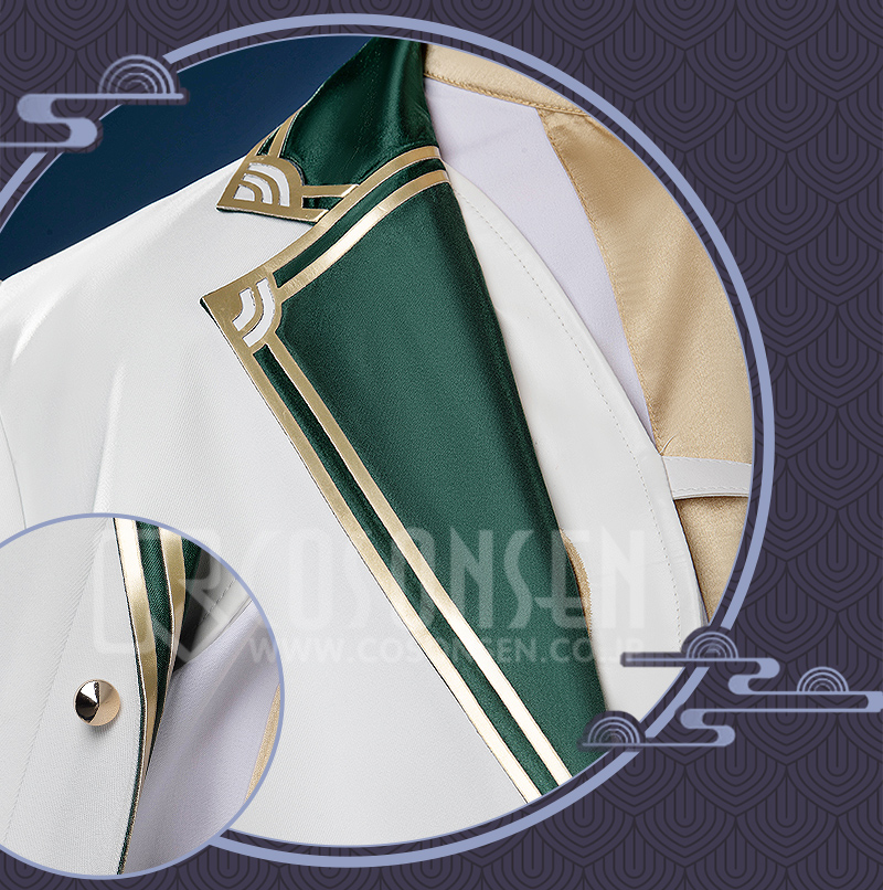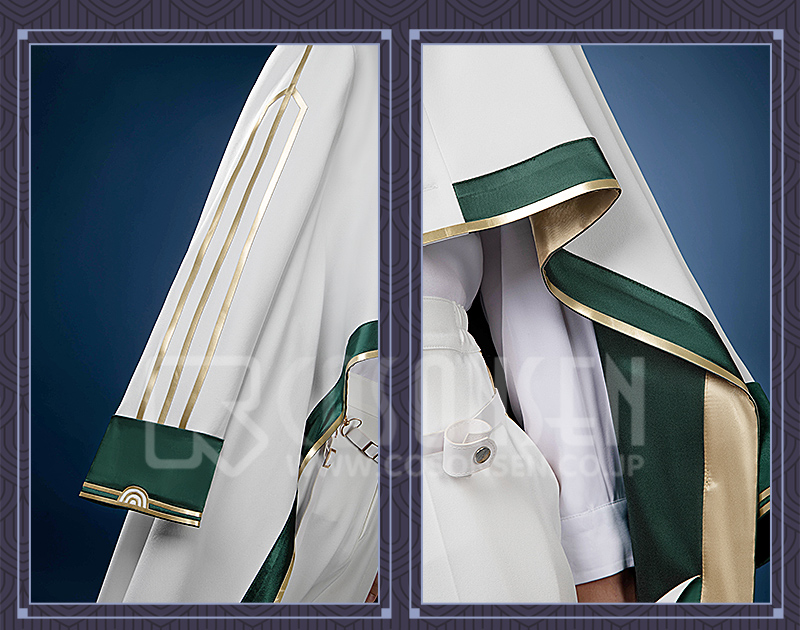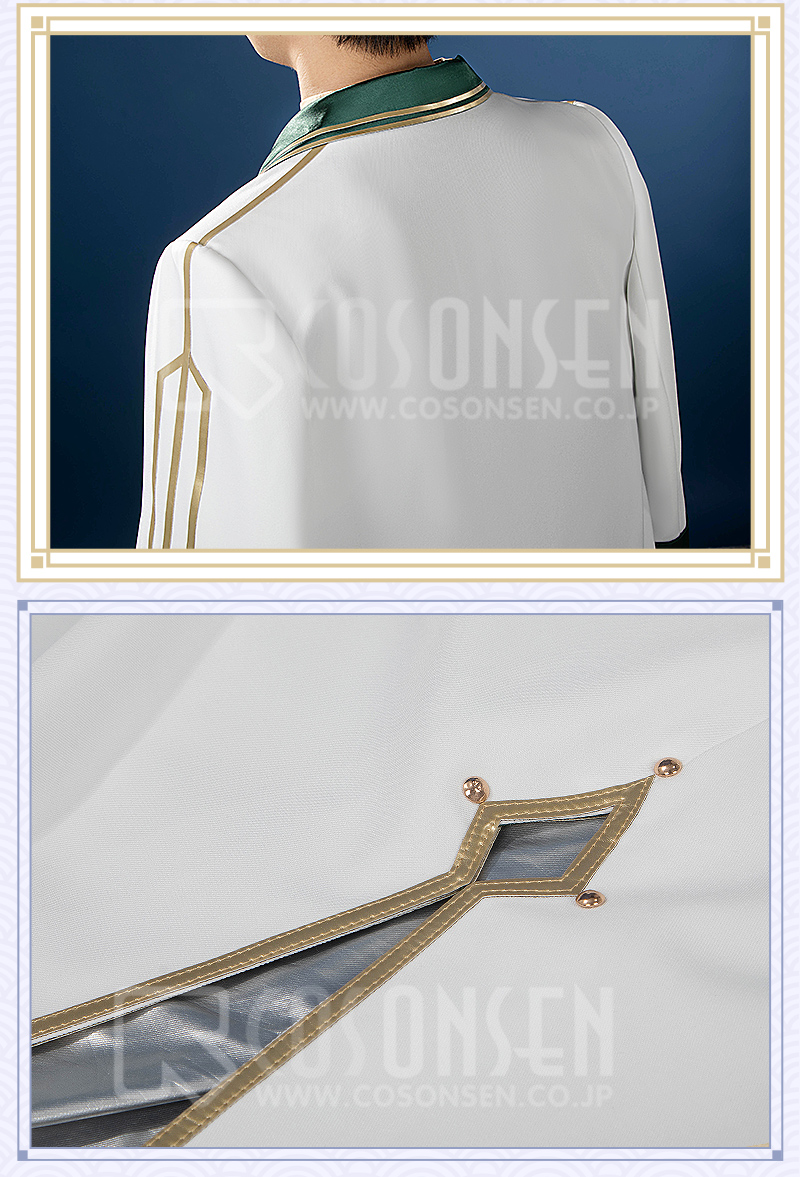 サ一ジで製作しています。緑と白を合わせてエレガントなコートで、原作に忠実して金色の縁取りが付いて綺麗に見えます。