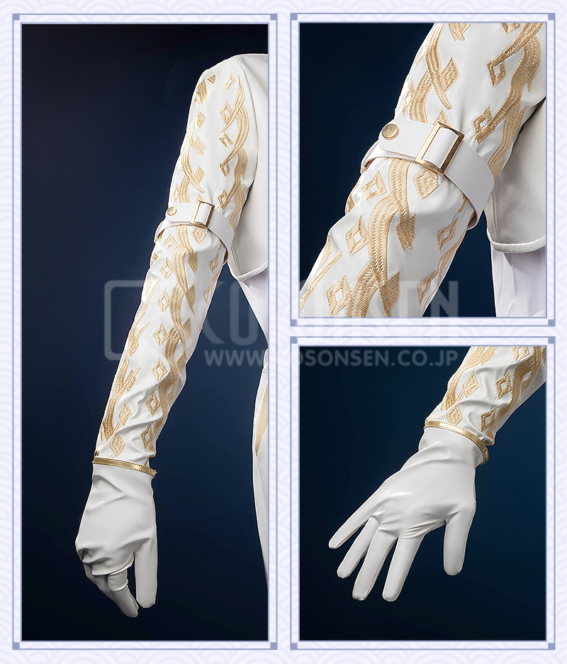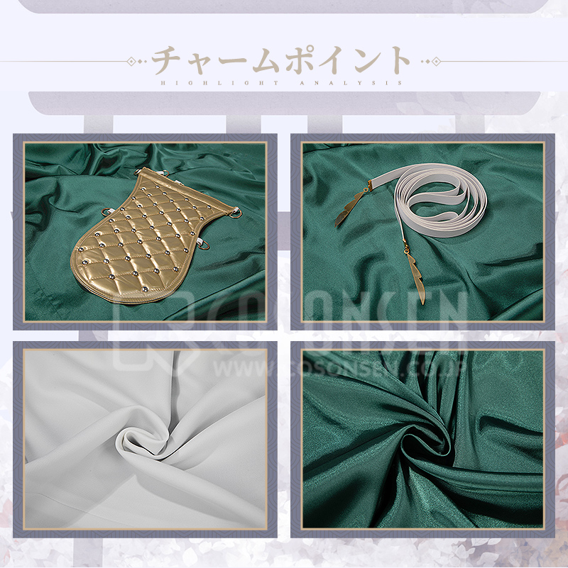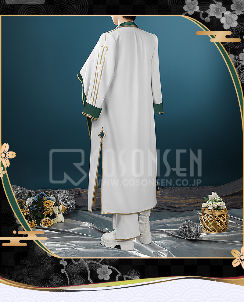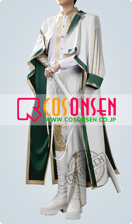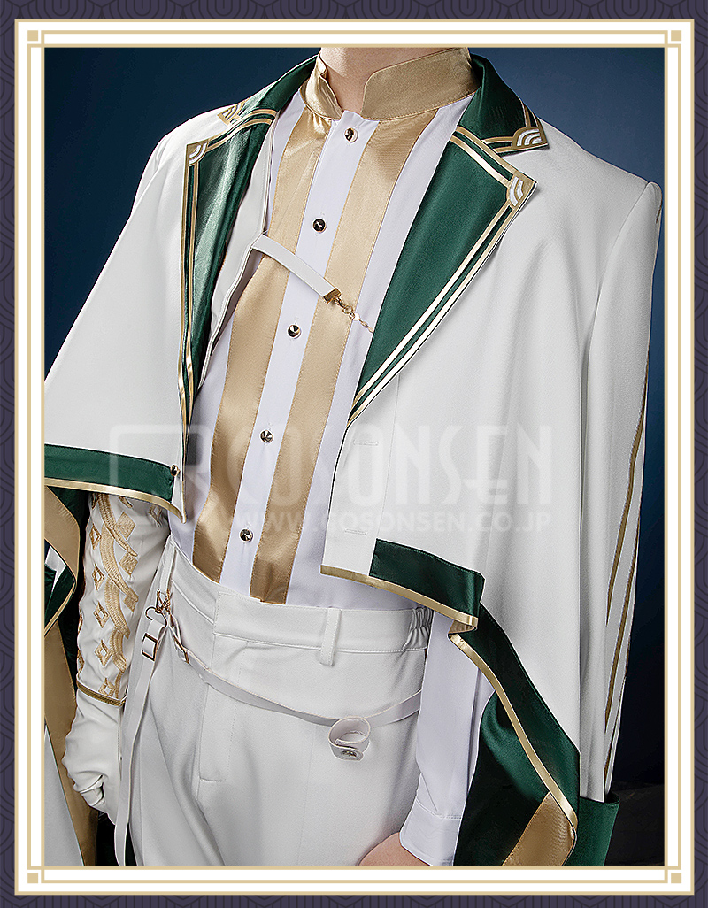サ一ジで製作しています。緑と白を合わせてエレガントなコートで、原作に忠実して金色の縁取りが付いて綺麗に見えます。