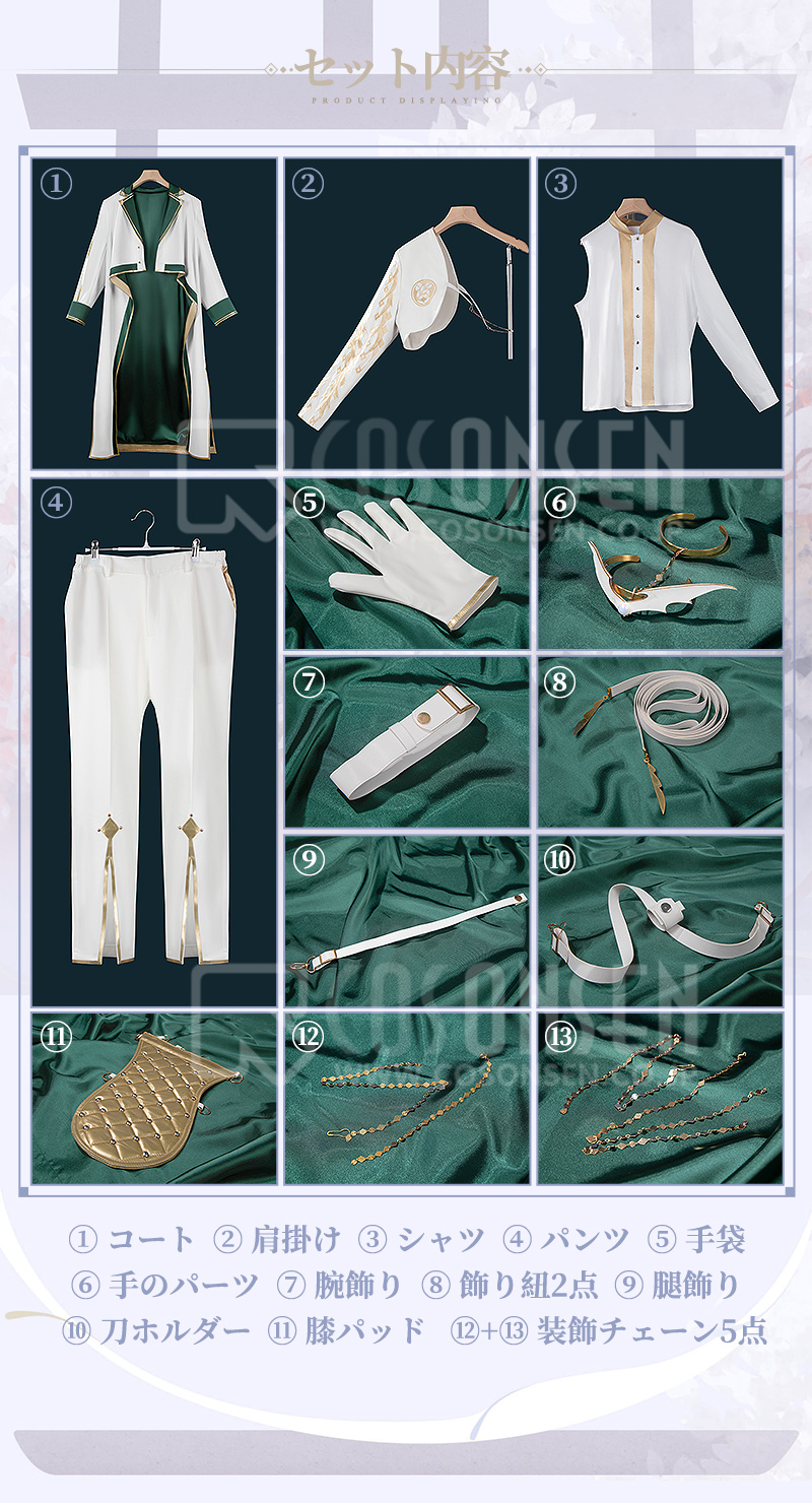 コート、肩掛け、シャツ、パンツ、飾り物(装飾チェーン5点、腕飾り、手袋、手のパーツ、飾り紐2点、腿飾り、刀ホルダー、膝パッド)