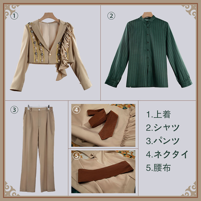 上着、シャツ 、パンツ、飾り物(ネクタイ、腰布)