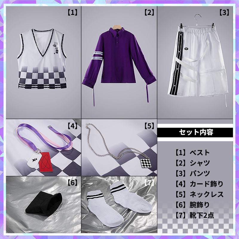 ベスト、シャツ、ズボン、飾り物(ネックレス1点、腕飾り1点、カード飾り1点、靴下2点)