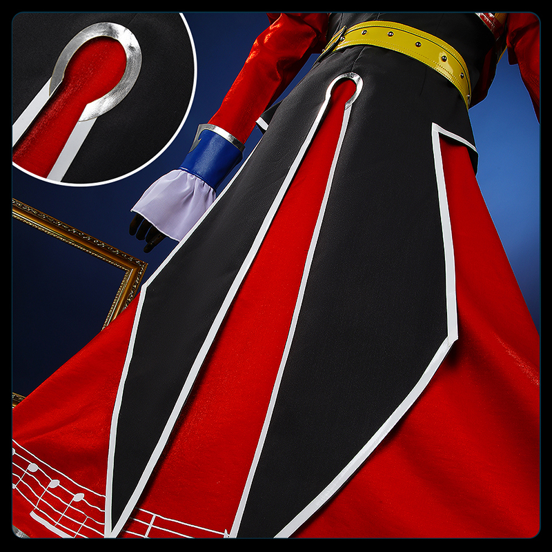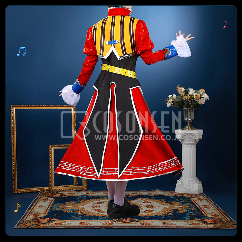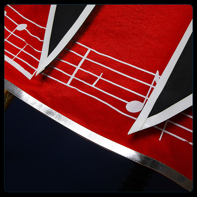 ポリエステルギャバと光沢布で製作しています。ブルーと赤を基調として、鮮やかな色合いが目を引き、裾にメロディーが流れるように楽譜柄がプリントされて再現度が高い。