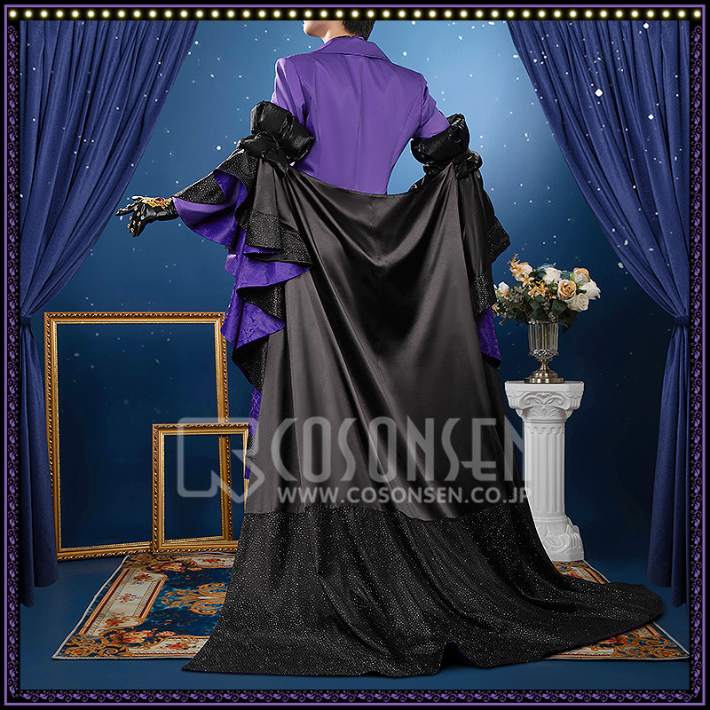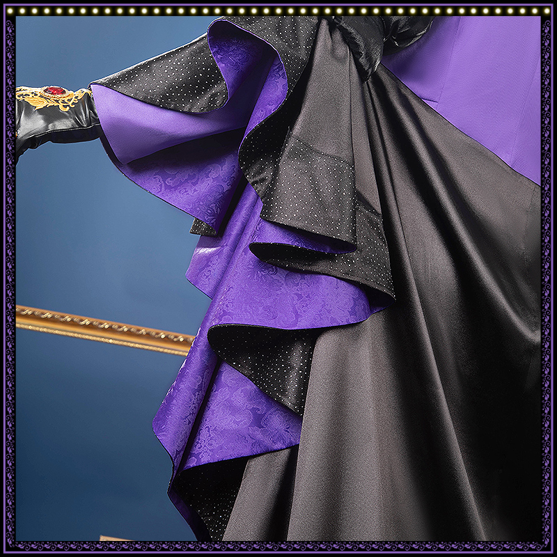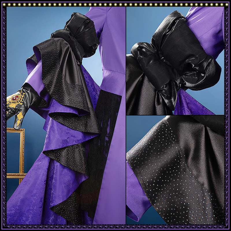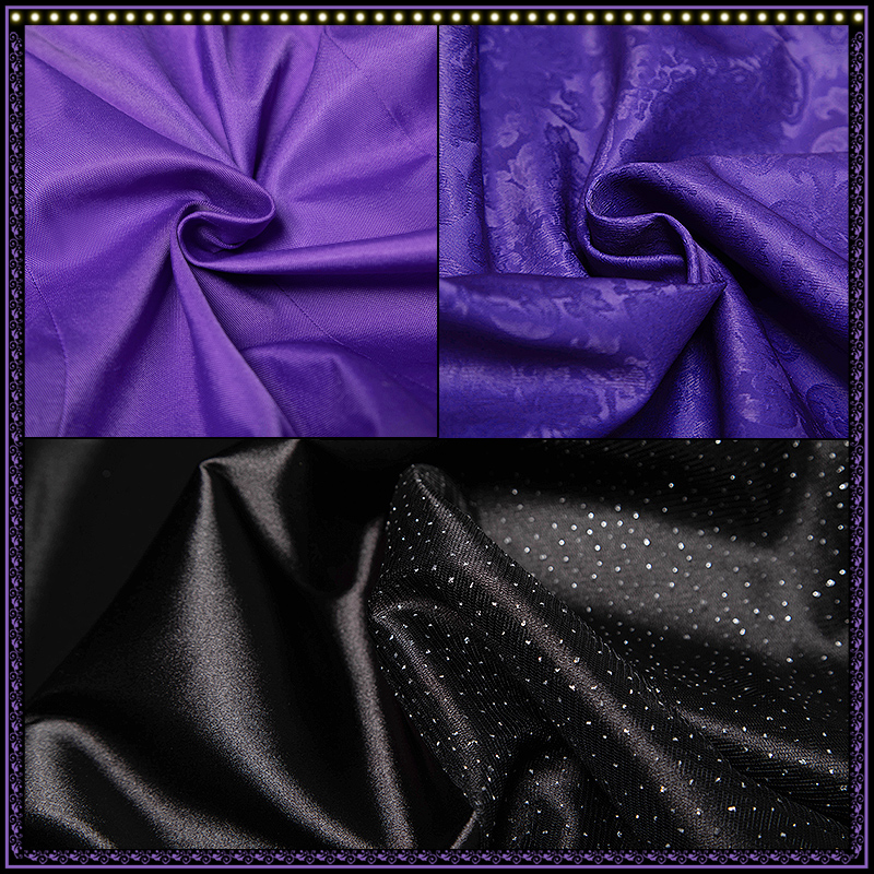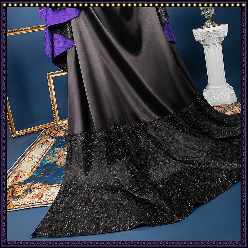 ジャガード生地、サテン、レースで製作しています。深みのある紫と黒を基調として、裾にスパンコール付きレースが縫製されていて、キラキラでエレガントでありながらも、神秘的な雰囲気を持ちます。上品な素材と丁寧な作りで、細部までしっかり再現された。